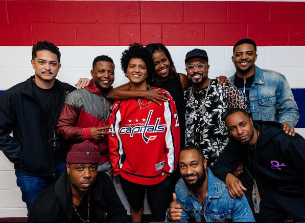 "Malam lalu di DC, Nyonya Obama datang ke konser, sungguh kehadirannya merupakan berkah #24kmagicworldtour #Hooligans," ujar Bruno pada keterangan fotonya bersama Michelle Obama pada akun Instagram miliknya.