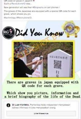 Merahputih.com - Akun Facebook RevolutionerG membagikan sebuah gambar seorang wanita memindai kode QR pada benda seperti bentuk batu nisan di kuburan Jepang dengan klaim jika memindai bisa mendapatkan informasi tentang kehidupan almarhum.