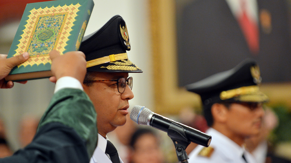 Pasangan pemenang Pilkada DKI Jakarta Anies Baswedan-Sandiaga Salahuddin Uno resmi dilantik sebagai sebagai Gubernur dan Wakil Gubernur periode 2017-2017 oleh Presiden Joko Widodo (Jokowi) di Istana Negara, Jakarta Pusat, Senin (16/10).