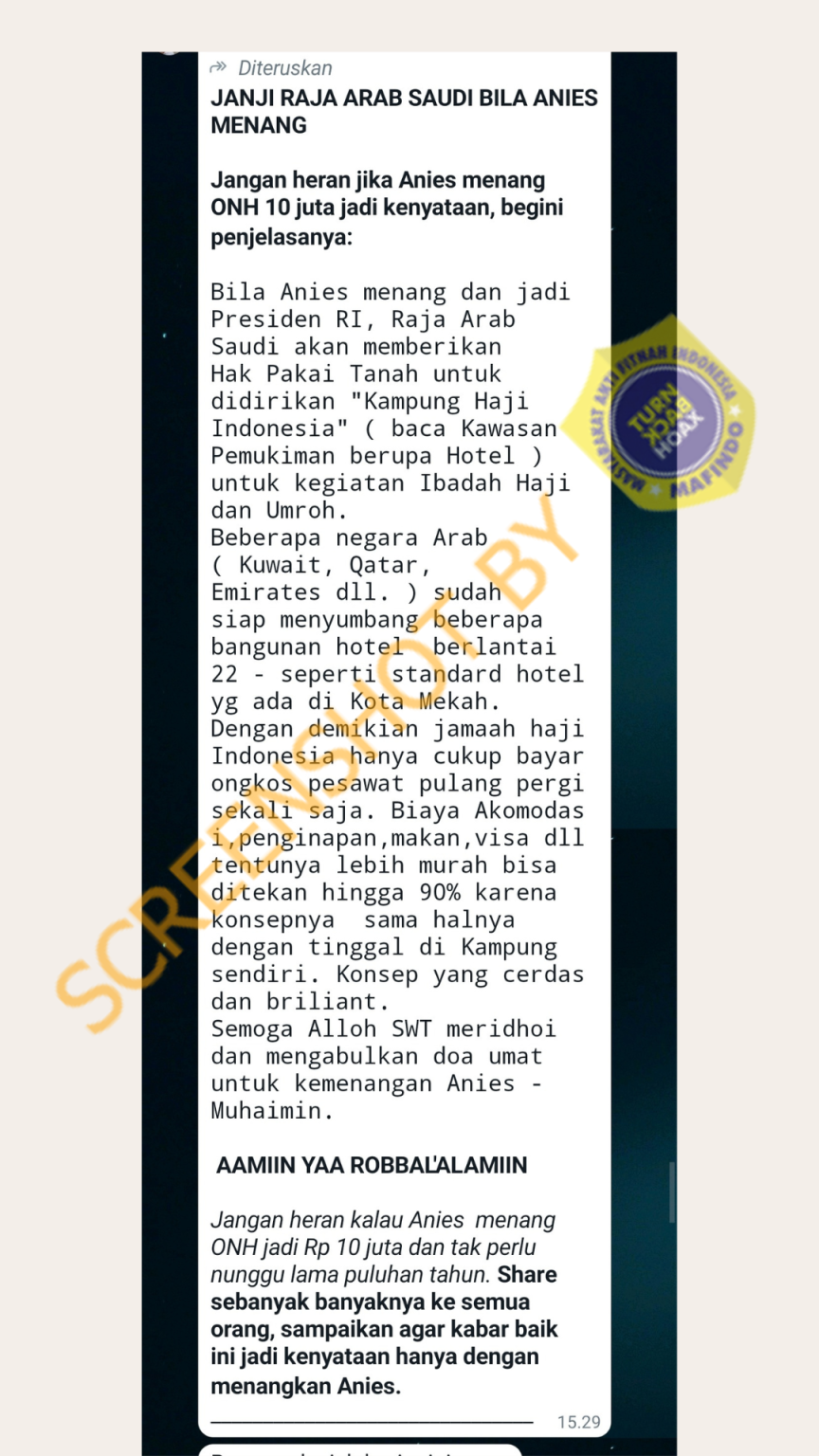 MerahPutih.com - Beredar sebuah pesan berantai melalui platform Whatsapp dengan klaim janji Raja Arab Saudi untuk memberikan hak pakai tanah untuk membangun “Kampung Haji” apabila Anies Baswedan menang pada kontestasi Pemilu 2024.