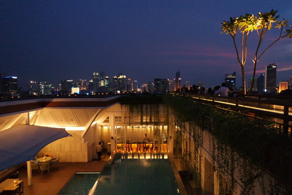 Bar ini berada di puncak gedung Hotel Indonesia Kempinski yang bersejarah. Sesuai namanya, kolam renang menjadi daya tarik utama tempat ini. Pengalaman kuliner dengan panorama lanskap 360 derajat di seputar kawasan Thamrin dan bundaran hotel Indonesia menjadi nilai plus.