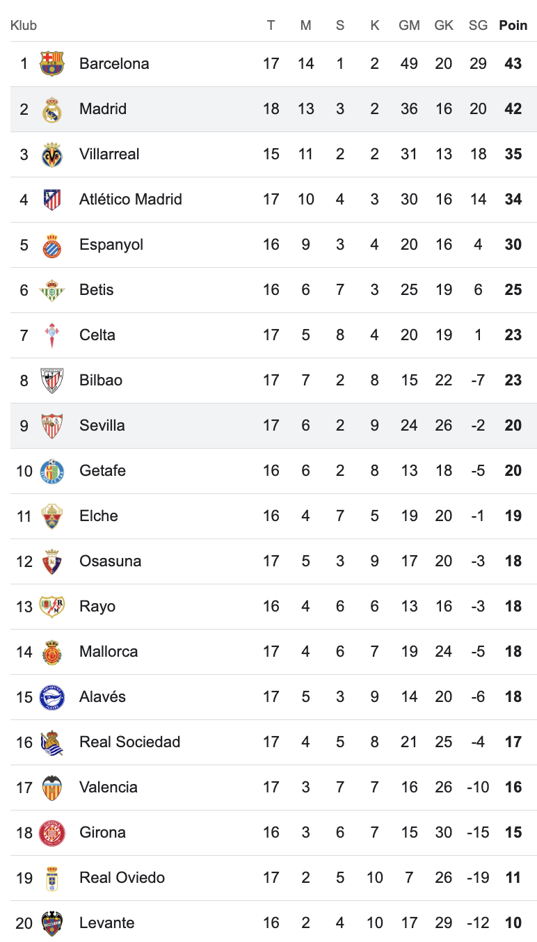 Berikut klasemen Liga Spanyol La Liga