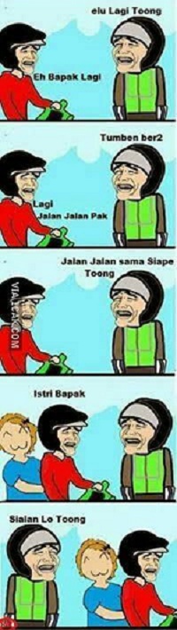 Ketika seorang seperti polisi yang kembali bertemu dengan seorang temannya bernama Otong. Bapak di meme yang dibikin seperti polisi tersebut pun menanyakan kepada Otong "tumben pergi berdua" dan dilanjutkan dengan pertanyaan dengan siapa ia pergi, Jawaban Otong adalah "Istrinya apak" Duh miris bener ya, guys.