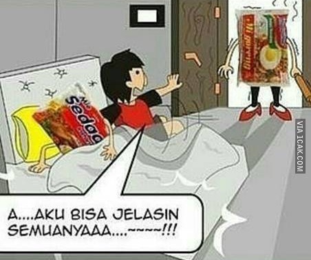 Pada gambar di atas terlihat seorang anak laki-laki yang memakai baju merah campur hitam ini panik, ketika dirinya ketahuan sedang berselingkuh dengan sebungkus mie dengan merk yang berbeda dari biasanya ia makan. Hadeuh ada-ada saja ya guys