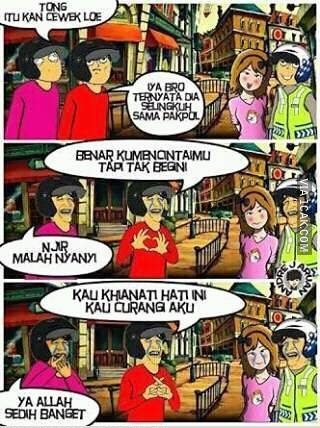 Hahaha seperti meme di atas, fans beratnya Anang Hermansyah, ya? Ketika ia sedang pergi bersama dengan temannya, ia memergoki pasangannya sedang berselingkuh dengan orang yang dibikin mirip seolah-olah seperti pak polisi. Ia pun bukannya marah tapi malah bernyanyi duhhhh sedih banget..