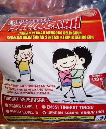 Nah, keripik ini menjadi salah satu makanan yang menyarankan Sahabat Merahputih untuk jangan pernah berselingkuh sebelum mencicipi sensasi keripik selingkuh ini. Bahkan keripik selingkuh memiliki tingkat rasa kepedasan seperti sabar level satu ataupun jangan sampai bunuh diri. Cukup mengerikan ya..