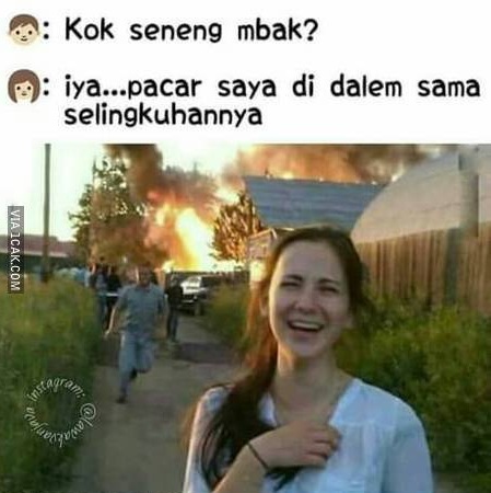 Dan yang terakhir, biasanya jika seorang perempuan diselingkuhi oleh pasangannya, ia akan merasakan sedih yang amat dalam. Namun, perempuan di dalam gambar ini malah terlihat senang ketika rumah pasangannya ia bakar bersamaan dengan selingkuhannya. Wow jangan coba-coba ya Sahabat Merahputih.