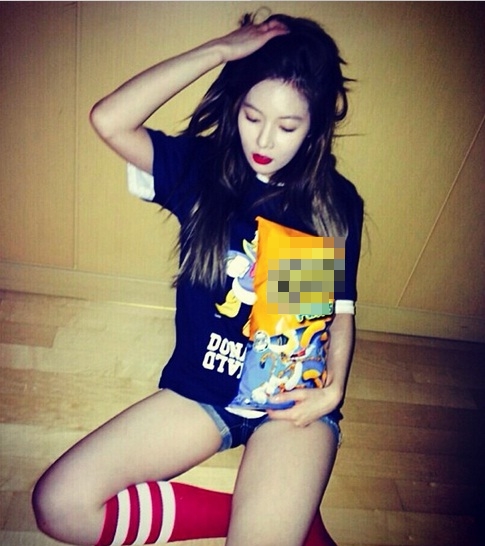 Dengan dibalut hot pants seksi, t-shirt bergambar donal duck yang lucu serta kaos kaki berwarna cerah, Hyuna terlihat sangat modis namun tetap terlihat seksi.