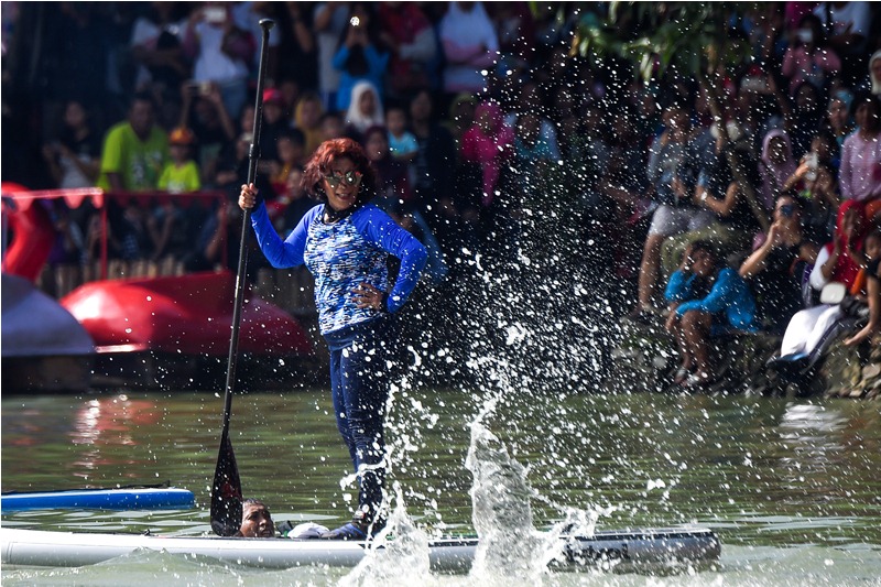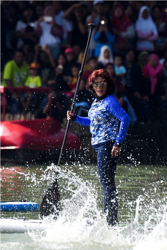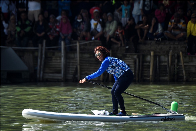 Merahputih.com - Menteri Kelautan dan Perikanan, Susi Pudjiastuti berhasil meraih kemenangan dalam acara lomba renang di Festival Danau Sunter melawan Wakil Gubernur DKI Jakarta Sandiaga Uno. Dalam perlombaan tersebut, Susi berdayung menggunakan paddle board, sedangkan Sandi benar-benar berenang. Banyak pemandangan menarik dalam perlombaan yang berlangsung seru tersebut.