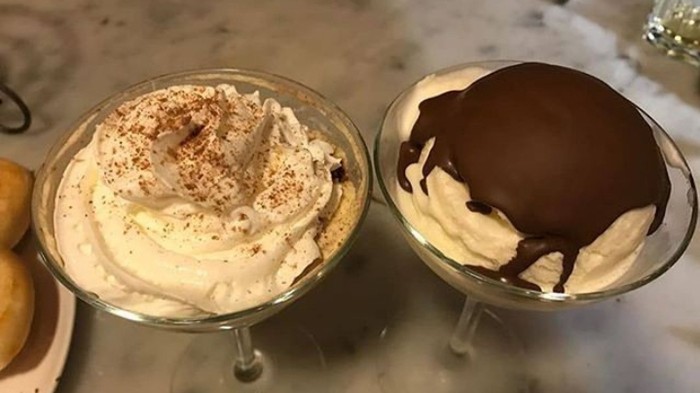 Es Krim Bawang Putih Gilroy, terinspirasi dari Gilroy, California, ibu kota bawang putih dunia, biasanya disajikan dengan saus cokelat.