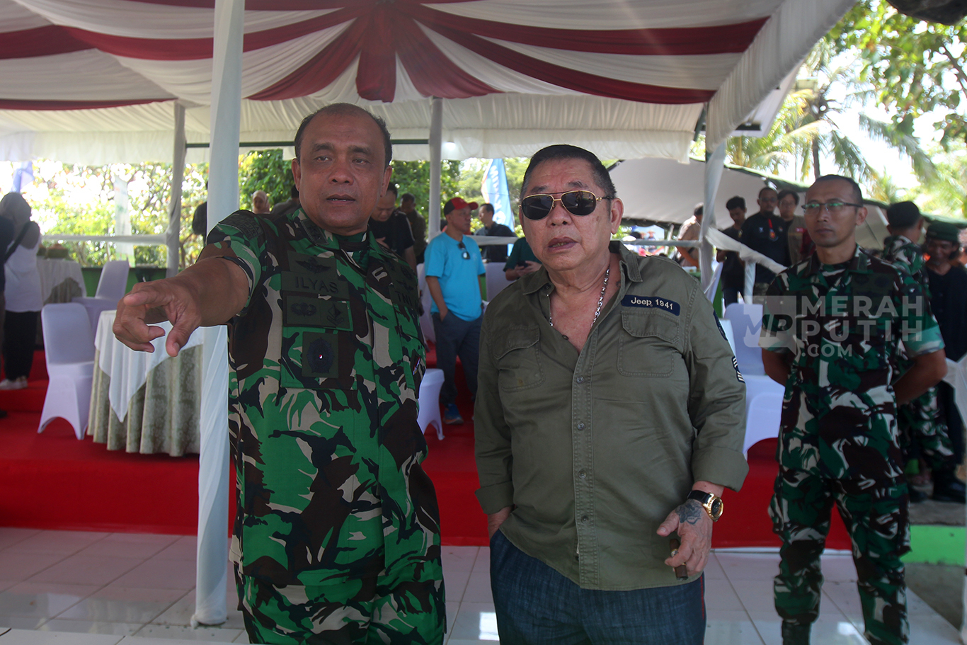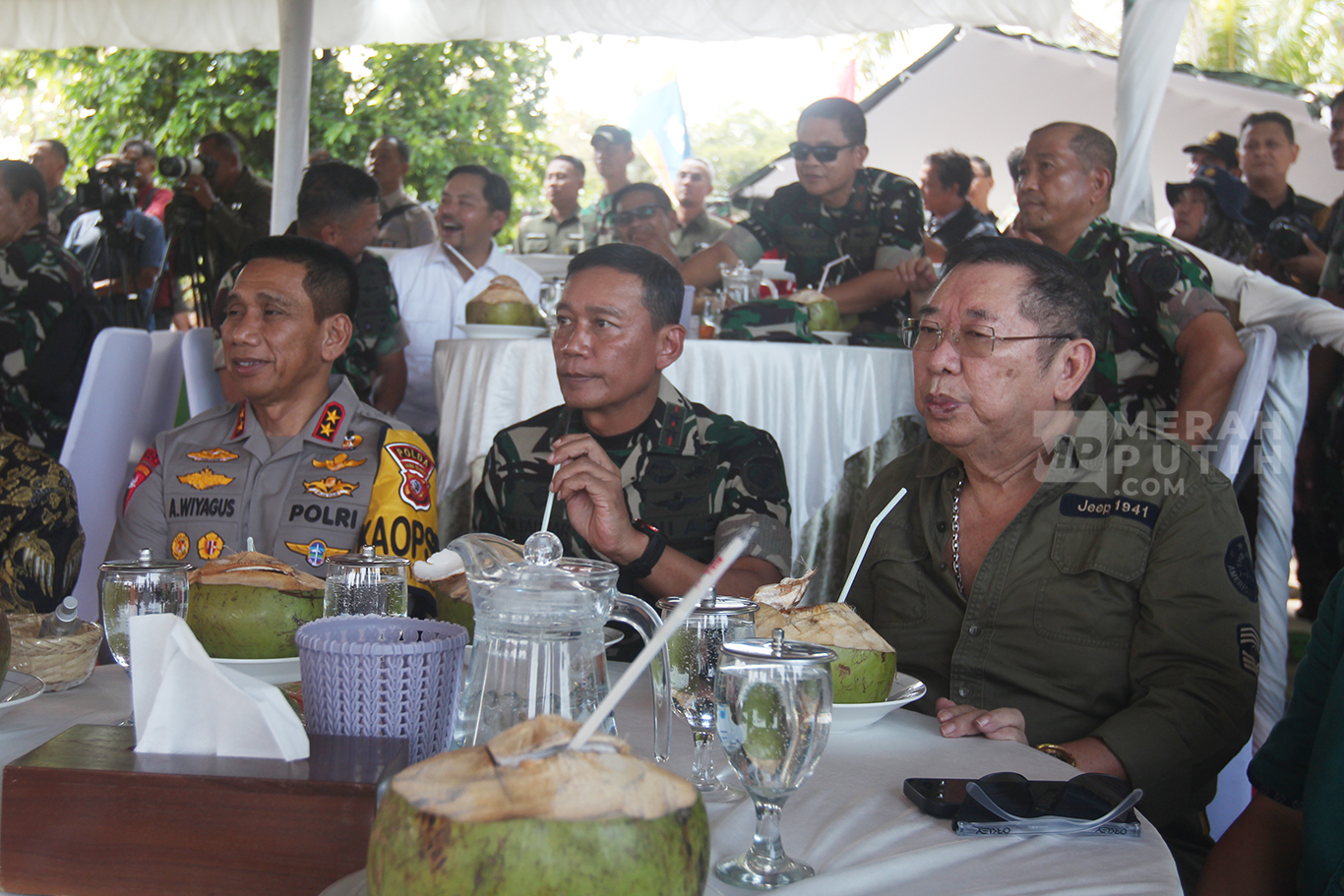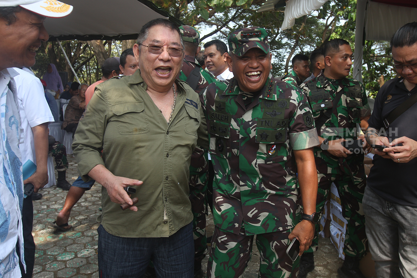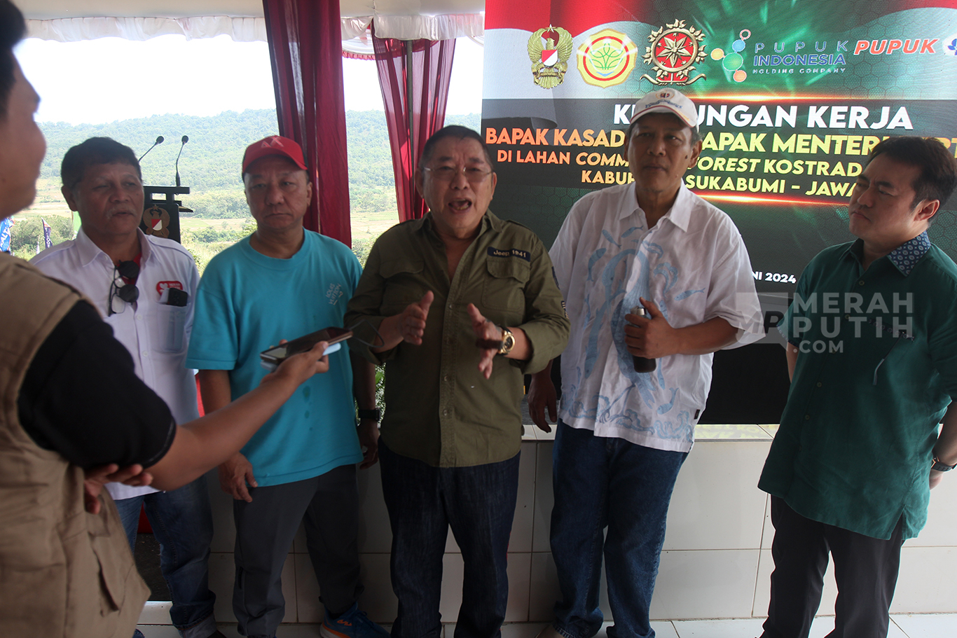 MerahPutih.com- Founder Yayasan JHL Merah Putih Kasih (JHL Foundation) Jerry Hermawan Lo (kiri) berbincang dengan Kepala Staf TNI Angkatan Darat (KSAD) Jenderal TNI Maruli Simanjuntak (kanan) dan Menteri Pertanian, Andi Amran Sulaiman di Sukabumi, Jawa Barat, Selasa (4/6/2024).