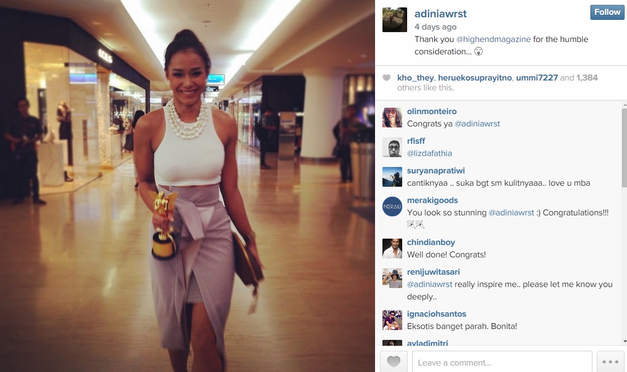 "Thank you @highendmagazine for the humble consideration..," tulisnya dalam sebuah caption foto saat ia memegang piala untuk penghargaan tersebut.