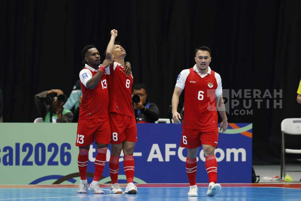 Merahputih.com - Pemain Timnas futsal Indonesia Ardiansyah Nur (tengah) bersama rekannya Samuel Eko (kanan) dan Wendy Brian Lindrey (kiri) melakukan selebrasi usai mencetak gol ke gawang Timnas futsal Kirgistan pada pertandingan grup A AFC Futsal Asian Cup 2026 di Indonesia Arena, Senayan, Jakarta, Kamis (29/1/2026).