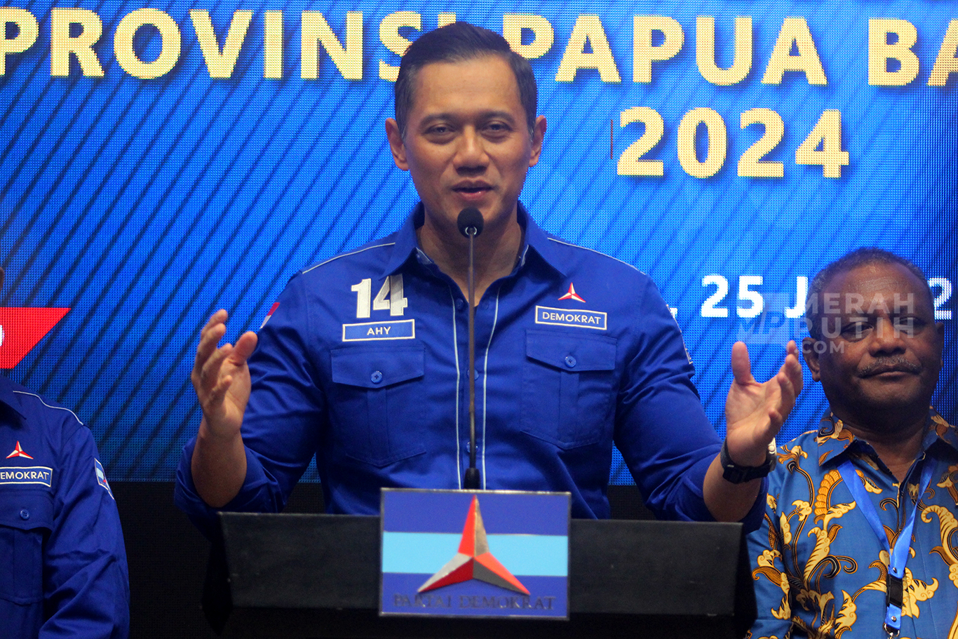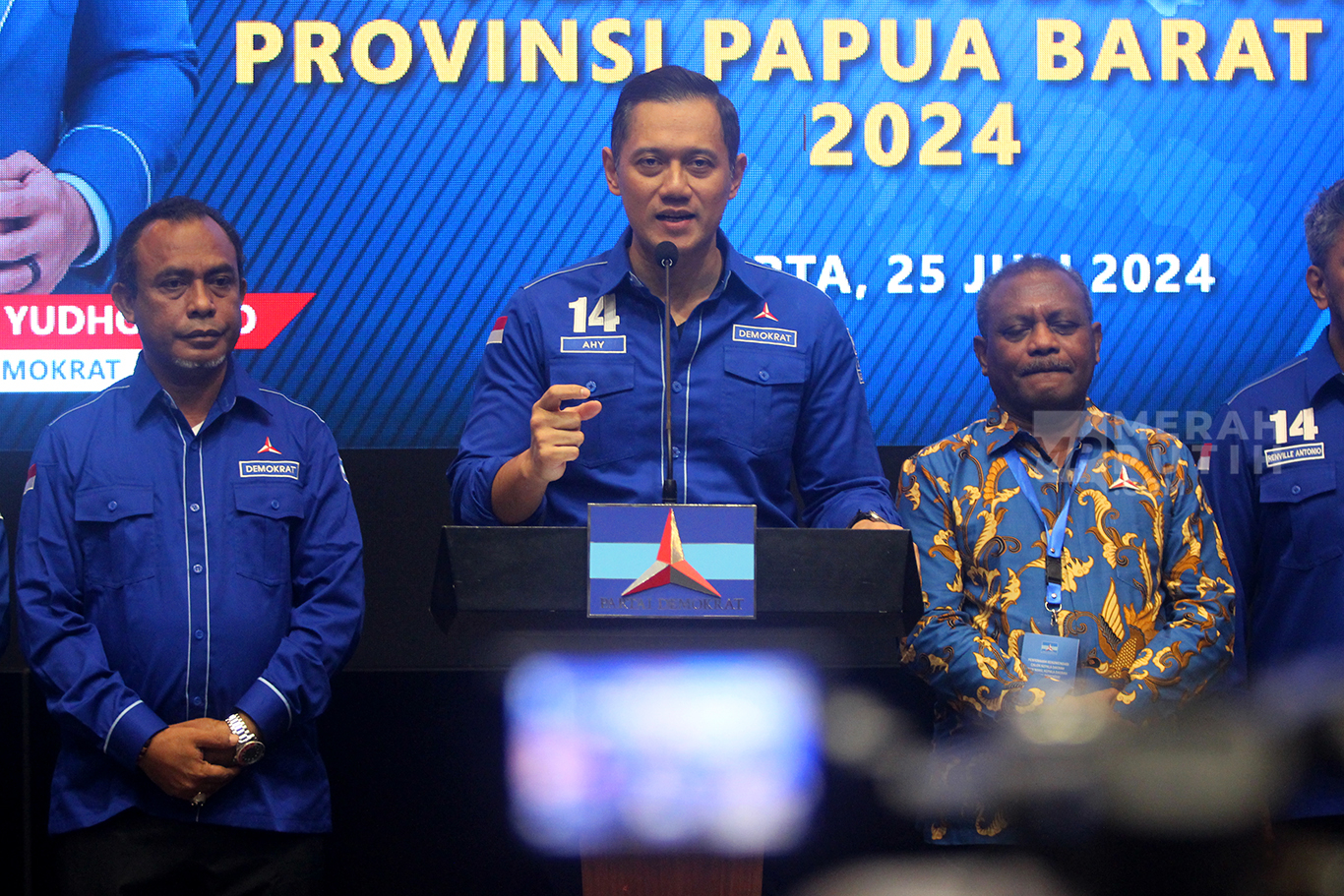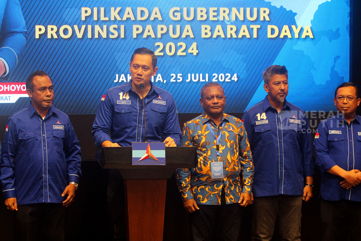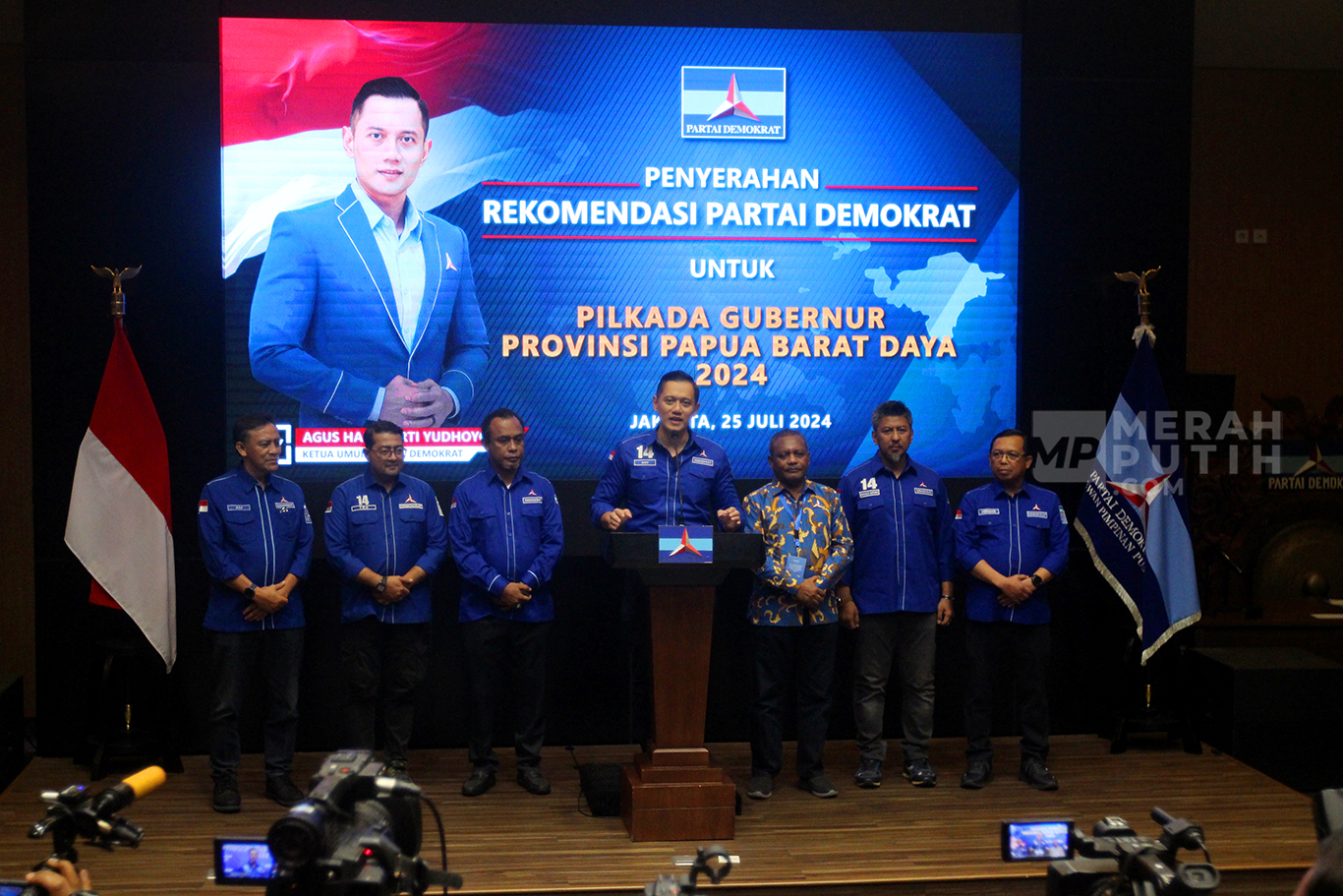 MerahPutih.com- Ketua Umum Partai Demokrat, Agus Harimurti Yudhoyono (AHY) menyerahkan surat rekomendasi secara simbolis kepada pasangan Calon Gubernur Papua Barat Daya Abdul Faris Umlati (Afu) dan Petrus Kasihiw untuk maju dalam Pilkada 2024 di Kantor DPP Partai Demokrat, Jakarta, Kamis (25/7/2024).