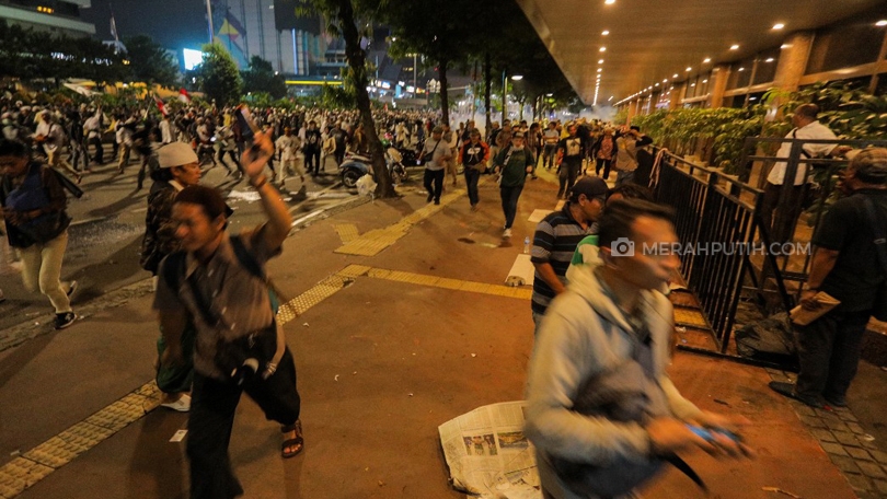 Sejumlah massa Aksi 22 Mei menghindari granat gas air mata yang dilontarkan aparat Kepolisian untuk membubarkan massa di jalan MH. Thamrin Jakarta, Kamis, (22/5/2019). Aksi 22 Mei menuntut BAWASLU mengungkap dugaan kecurangan pada Pemilu 2019 setelah Komisi Pemilihan Umum (KPU) RI menetapkan rekapitulasi hasil penghitungan suara tingkat nasional Pemilu 2019. Hasilnya pasangan nomor urut 01 Joko Widodo atau Jokowi - Ma'ruf Amin unggul 55,50 persen. Merahputih.com / Rizki Fitrianto