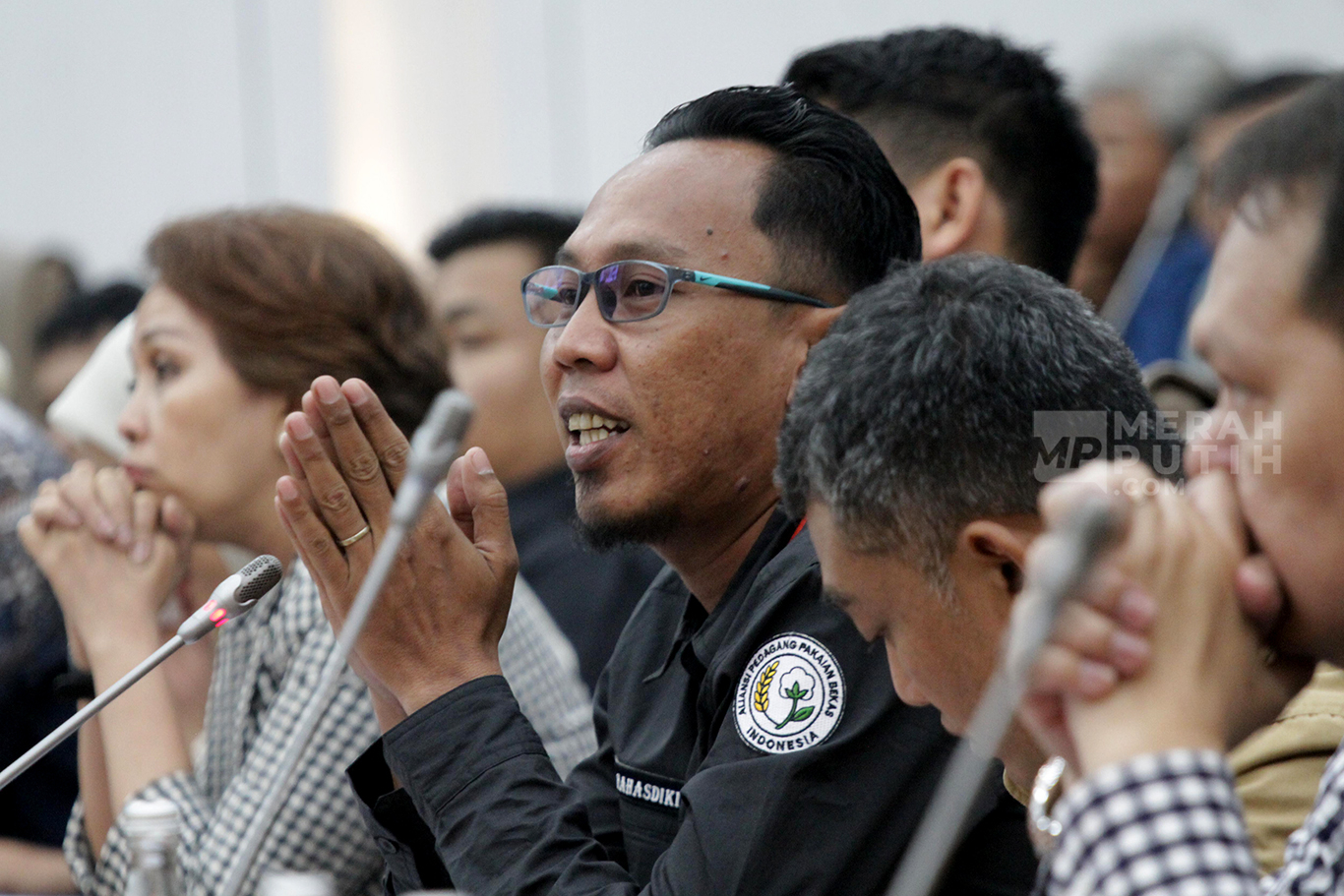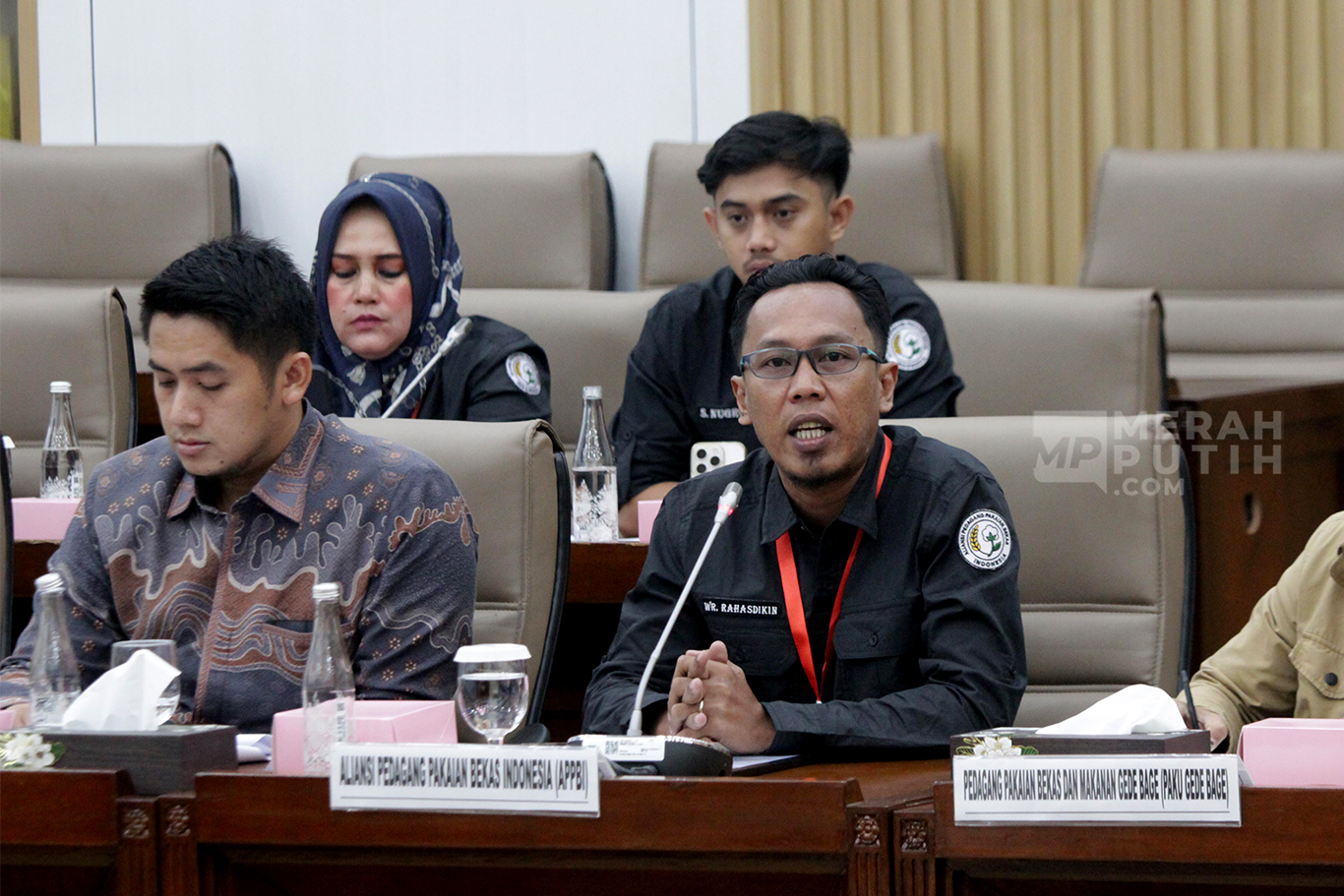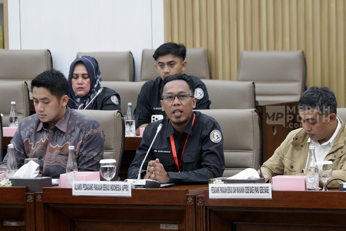 Merahputih.com - Ketua Aliansi Pedagang Pakaian Bekas Indonesia (APPBI) WR Rahasdikin menyampaikan aspirasi saat beraudiensi dengan Komisi VI DPR, di Gedung Nusantara I, Kompleks Parlemen, Senayan, Jakarta, Selasa (2/12/2025).