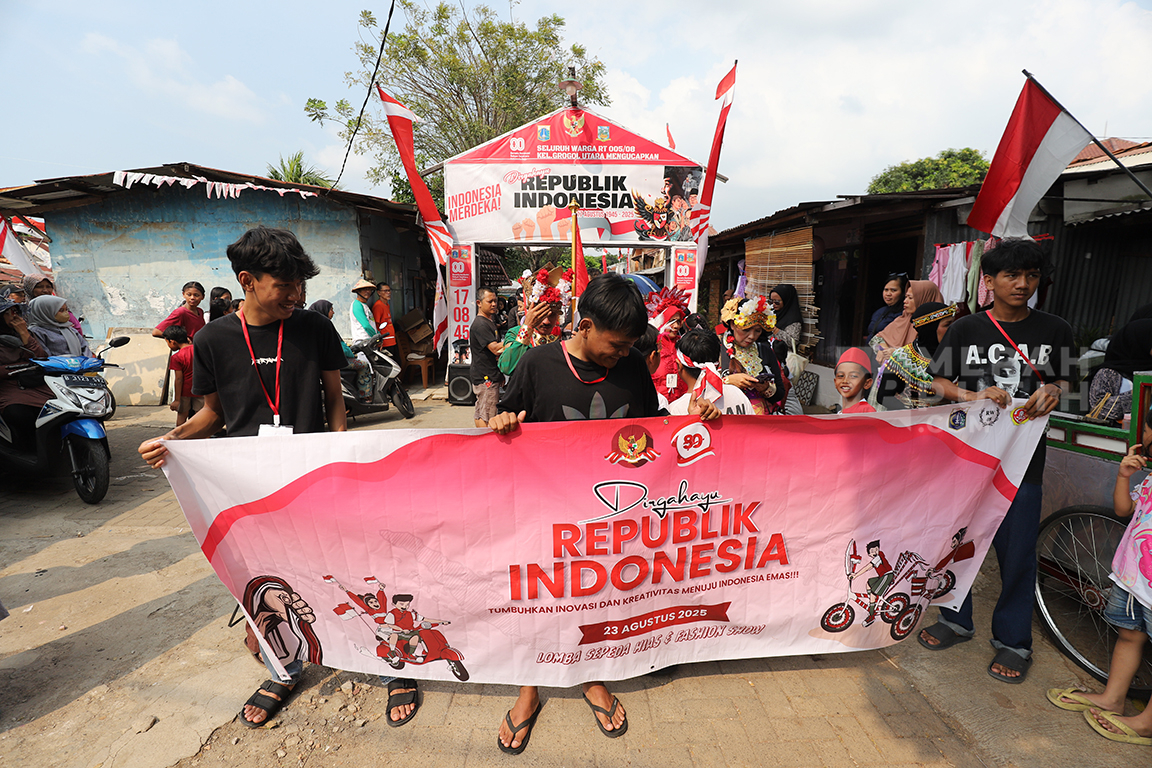 Ratusan warga dari Rw 08 Grogrol utara tumpah ruah ke jalan utama untuk memeriahkan peringatan Hari Kemerdekaan dengan tema Tumbuhkan Inovasi dan Kreativitas Menuju Indonesia Emas.