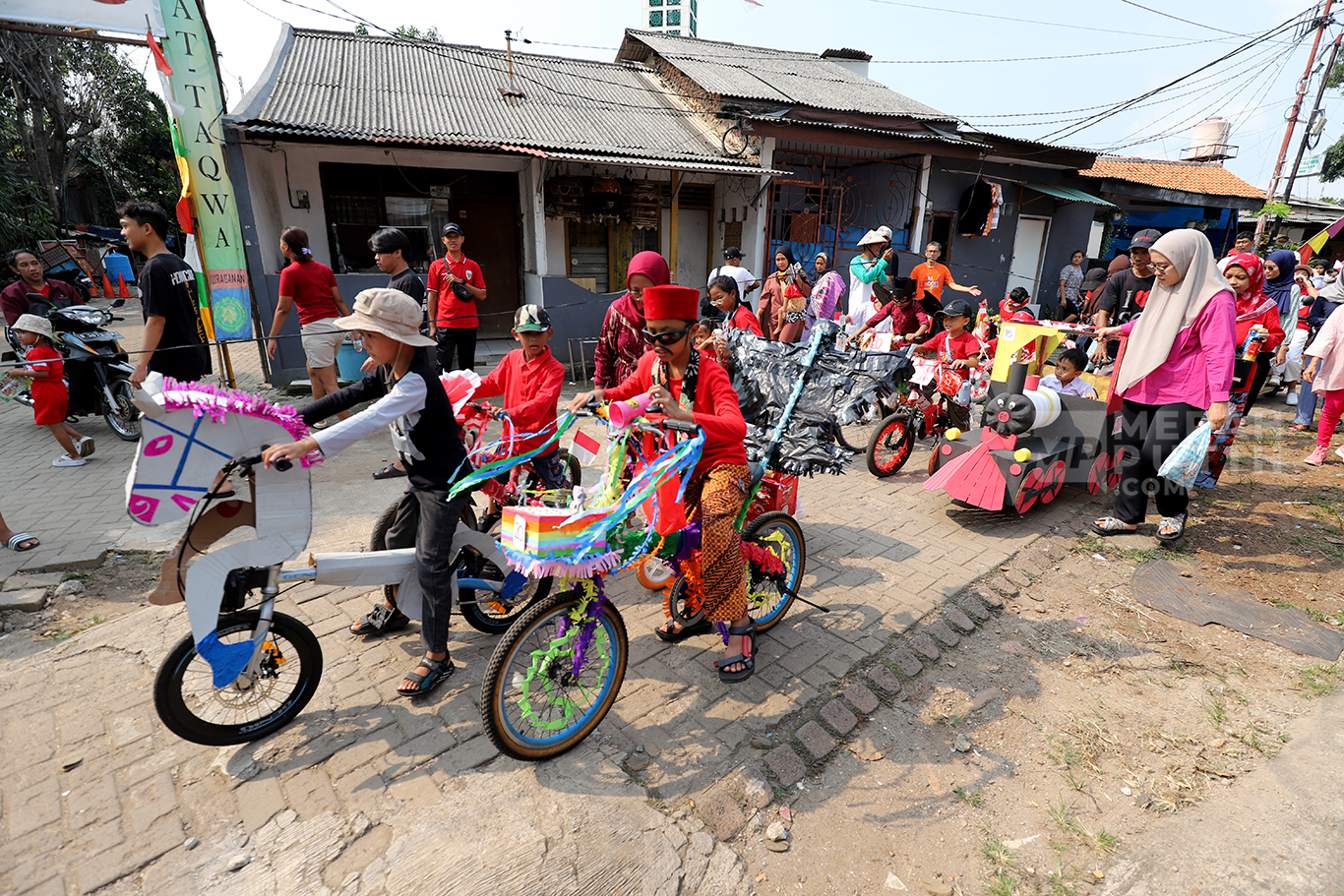 Mereka tampil semarak dengan beragam kostum unik sebagai wujud cinta Tanah Air mulai dari pakaian adat Nusantara, seragam profesi, hingga tokoh pahlawan nasional. Tak sedikit pula yang menghias sepeda mereka dengan pita dan bendera kecil, menambah warna dalam iring-iringan karnaval.