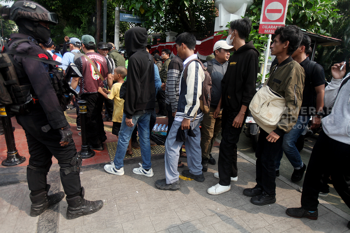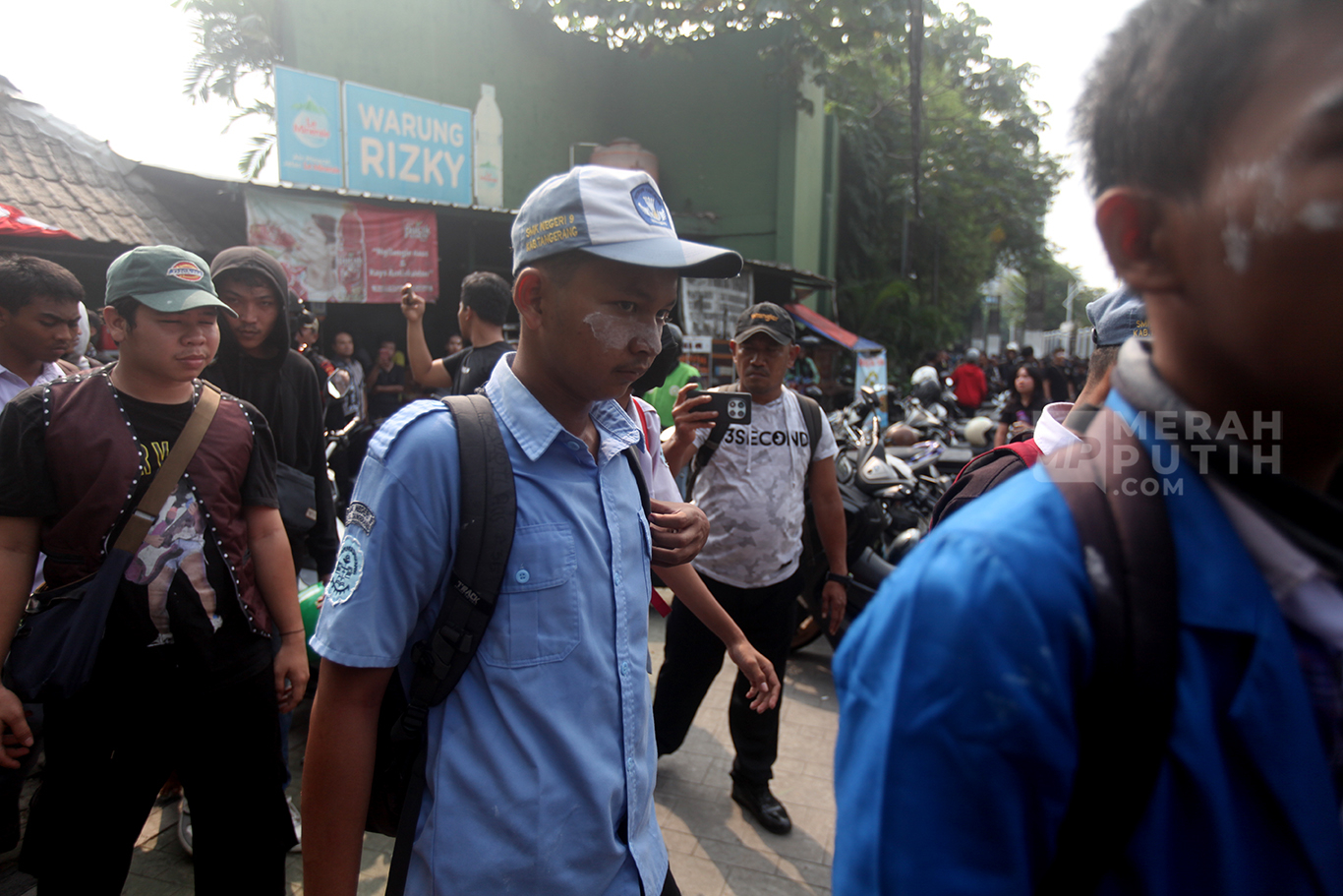 Pasukan Brimob membubarkan pelajar SMA yang mengikuti aksi unjuk rasa di Gedung DPR. Mereka dibubarkan paksa secara persuasif sebelum kericuhan meletus. Sabanyak ratusan pelajar SMA dengan seragam dan pakaian biasa mengikuti aksi unjuk rasa. Mereka terlihat di kawasan Gerbang Pemuda, Senayan, Jakarta.