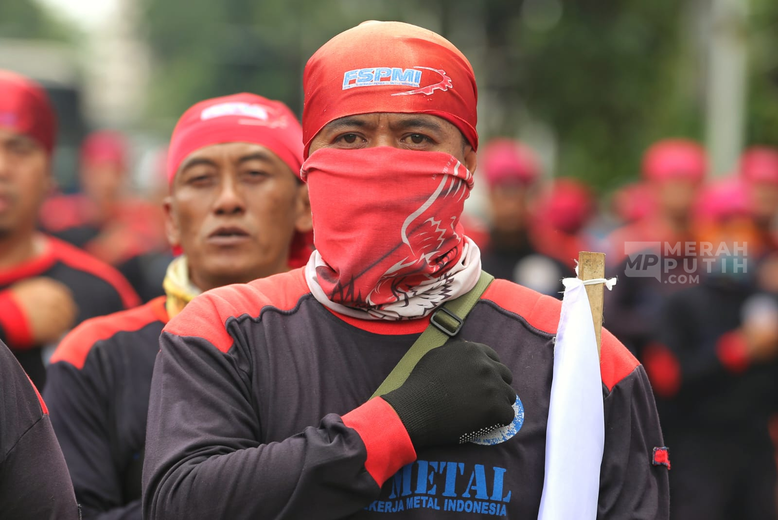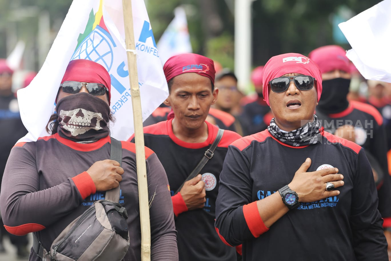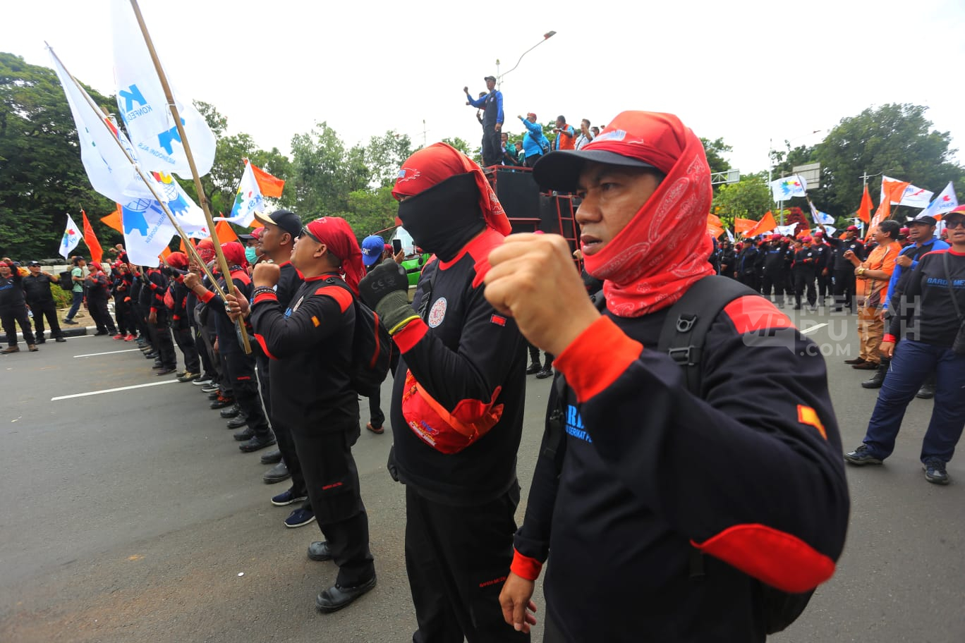 Merahputih.com - Aksi massa buruh menggelar unjuk rasa di Jalan Medan Merdeka Selatan, Silang Monas, Jakarta Pusat, Senin (29/12/2025).