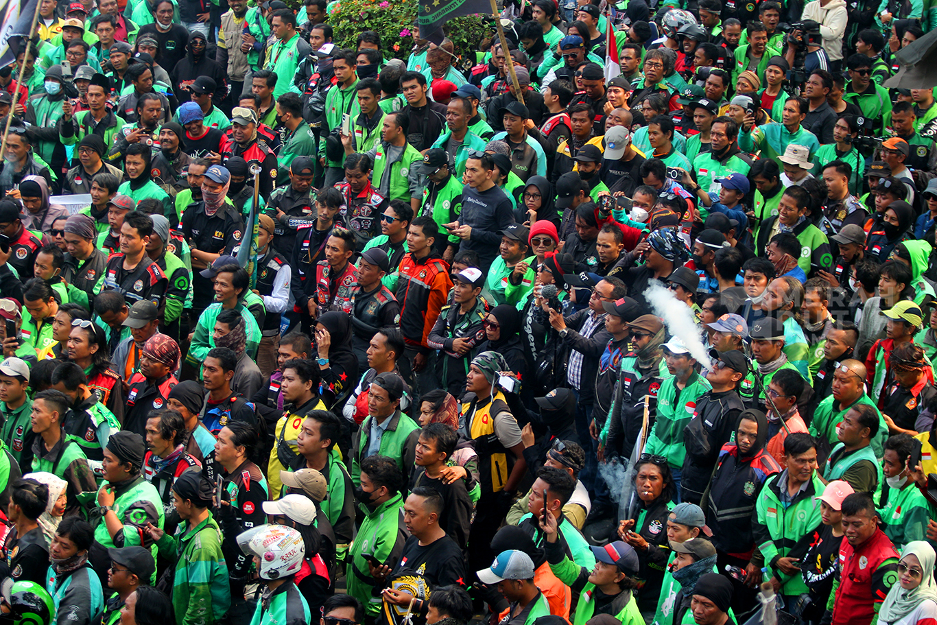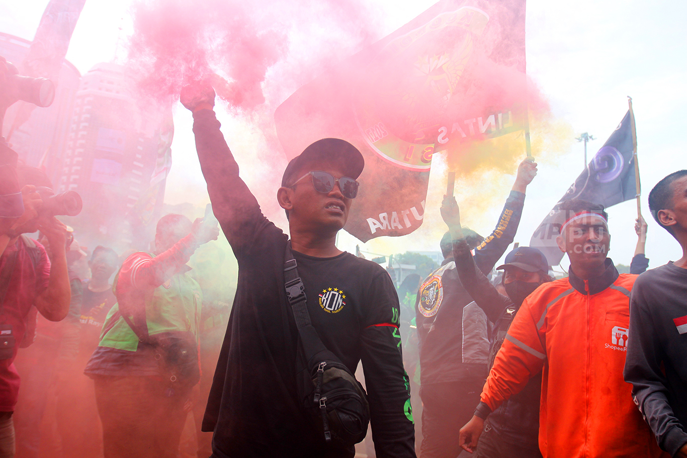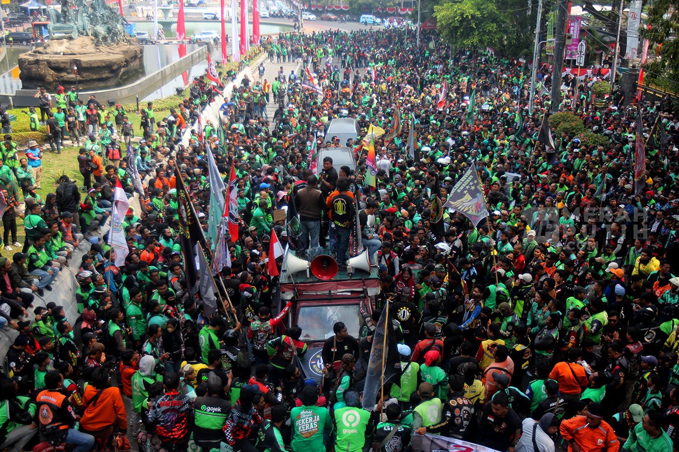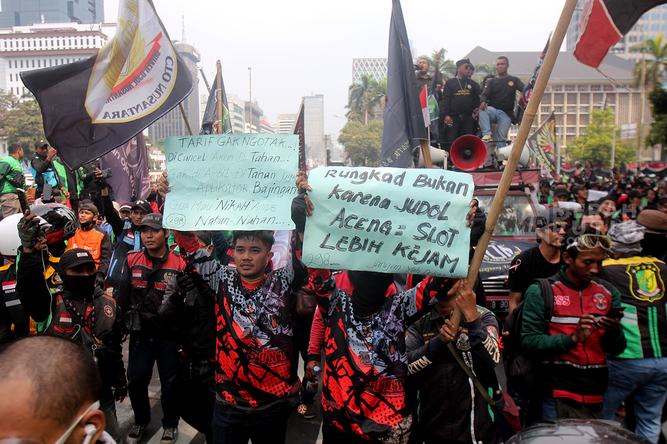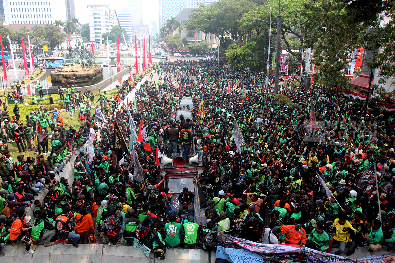 Aksi Demo Ribuan Driver Ojek Online dan Kurir Online di Patung Kuda
