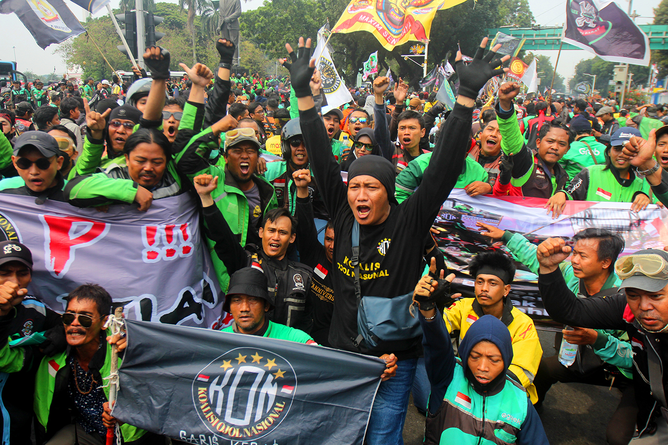 Koalisi Ojol Nasional (KON) demo driver ojol menuntut agar pemerintah dan perusahaan transportasi online untuk melegalkan status profesi driver ojol dalam undang-undang (UU). Selain itu, driver ojol juga menuntut perusahaan aplikasi untuk menurunkan biaya potongan aplikasi.
