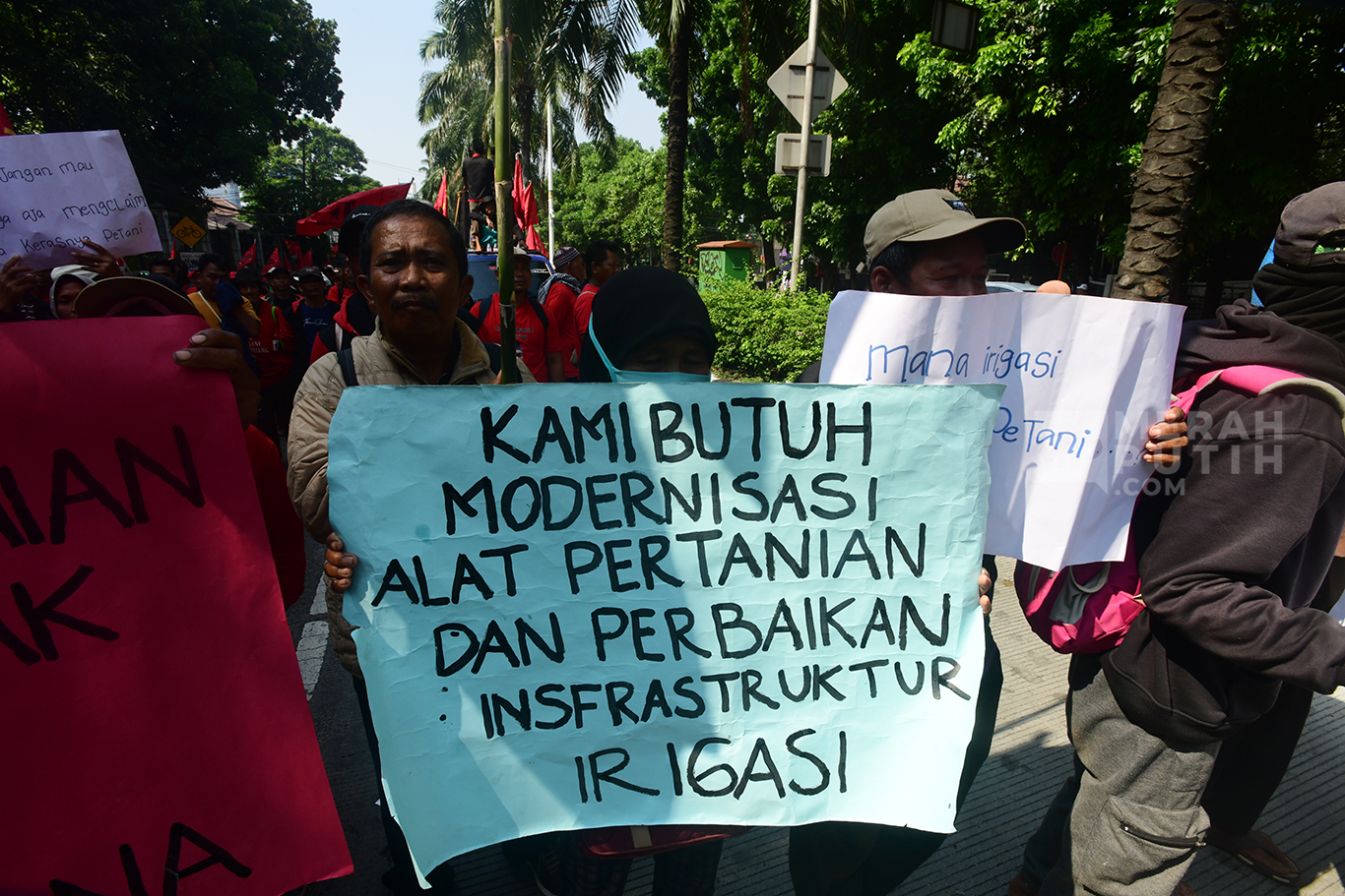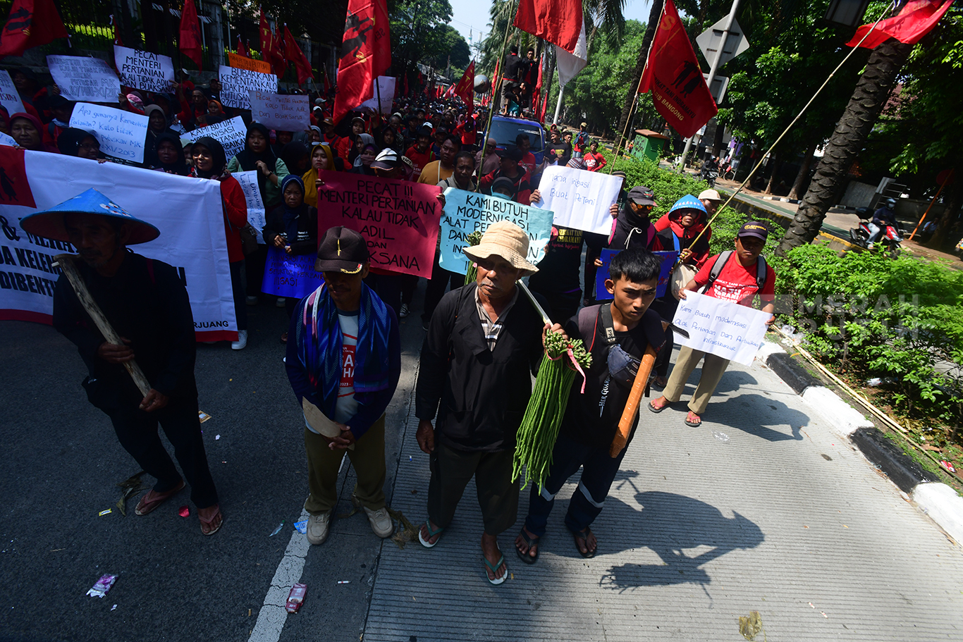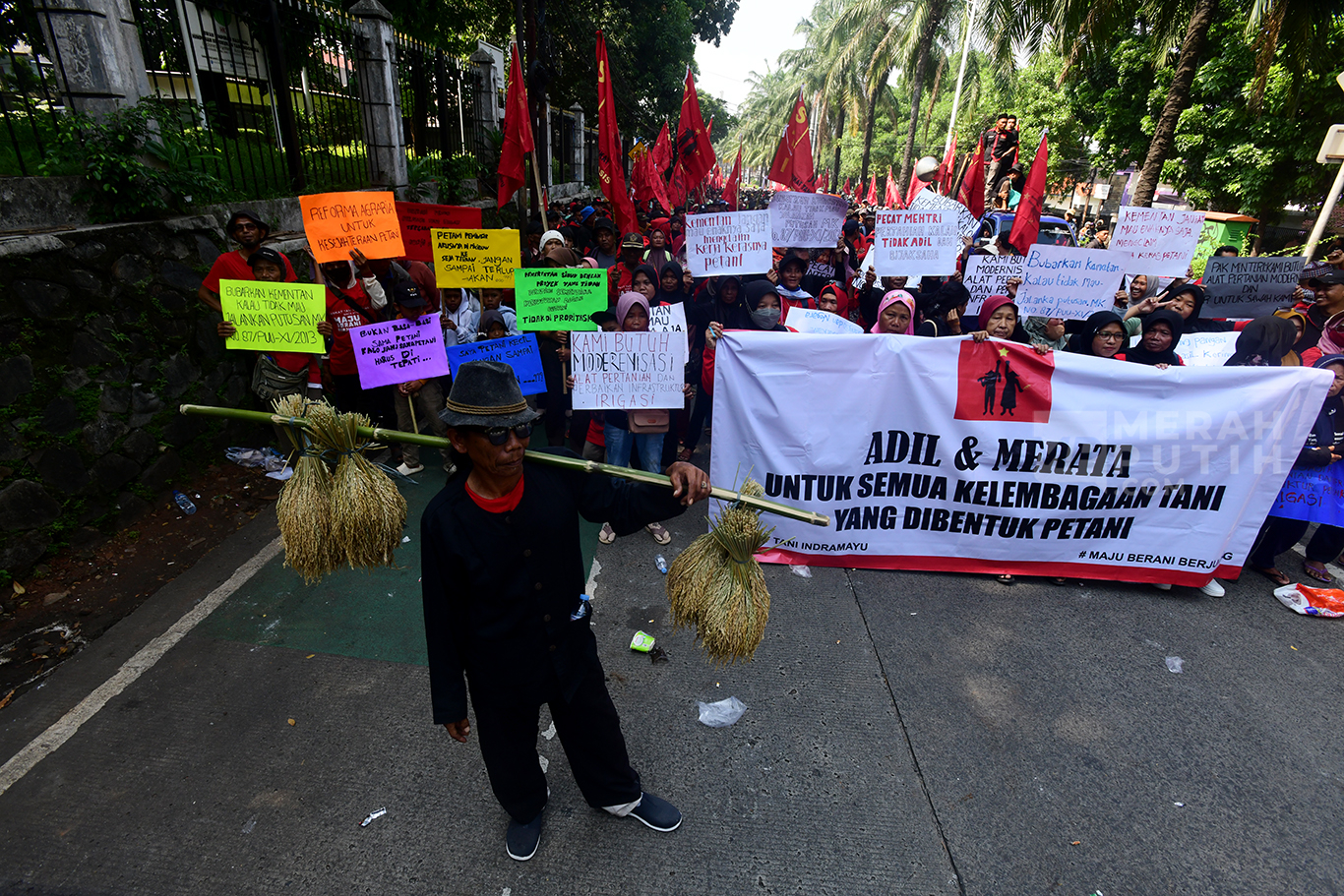 Memperingati Hari Tani Nasional, para petani Indramayu menggelar aksi di depan gedung Kementerian Pertanian untuk menuntut perbaikan irigasi serta modernisasi pertanian di Indramayu Barat.