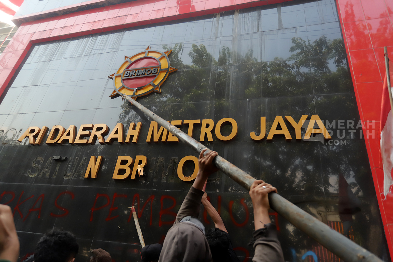 Merahputih.com - Suasana pengunjuk rasa menggeruduk Mako Brimob saat aksi di depan Markas Komando Brimob Polda Metro Jaya, Kwitang, Jakarta, Jumat (29/8/2025).