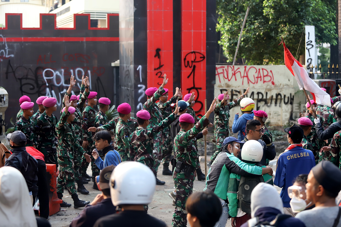 Massa aksi kembali mendatangi Markas Satuan Brimob Polda Metro Jaya di Kwitang, Jakarta Pusat. Massa yang sempat bubar sebelum pukul 12.00 WIB, kembali datang siang hari ini.