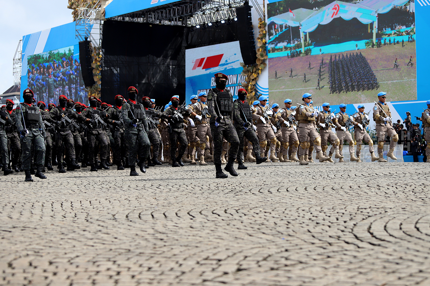Puncak peringatan HUT ke-79 Bhayangkara menampilkan defile pasukan elit Polri diantaranya Baintelkam atau Badan Intelejen dan Keamanan Polri, Bareskrim atau Badan Reserse Kriminal Polri, Baharkam atau Badan Pemeliharaan Keamanan Polri, Korlantas atau Korps lalu Lintas dan Brimob atau Korps Brigade Mobil (pasukan elite), Bakomsus Ketahanan Pangan, hingga jajaran Polwan.