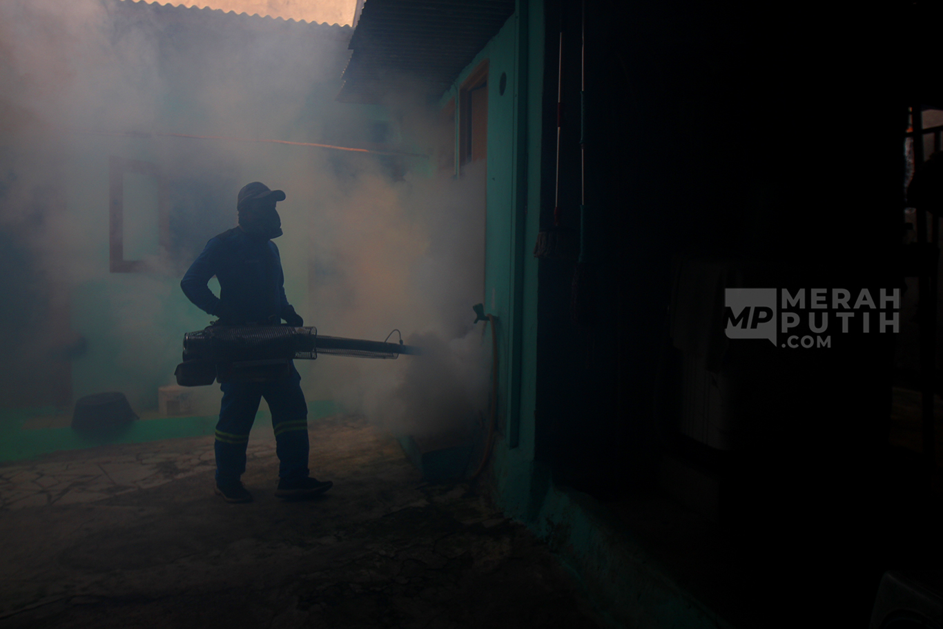 MerahPutih.com- Petugas dari Puskesmas Kecamatan Kebayoran Lama melakukan fogging atau pengasapan terhadap lingkungan padat penduduk di Kawasan Kebayoran Lama Utara, Jakarta Selatan, Jum'at (7/6/2024).