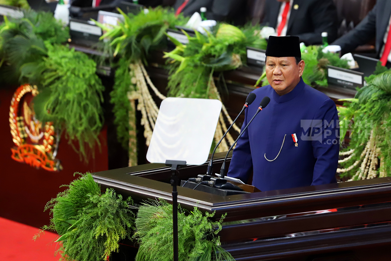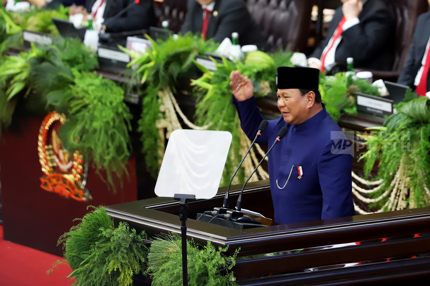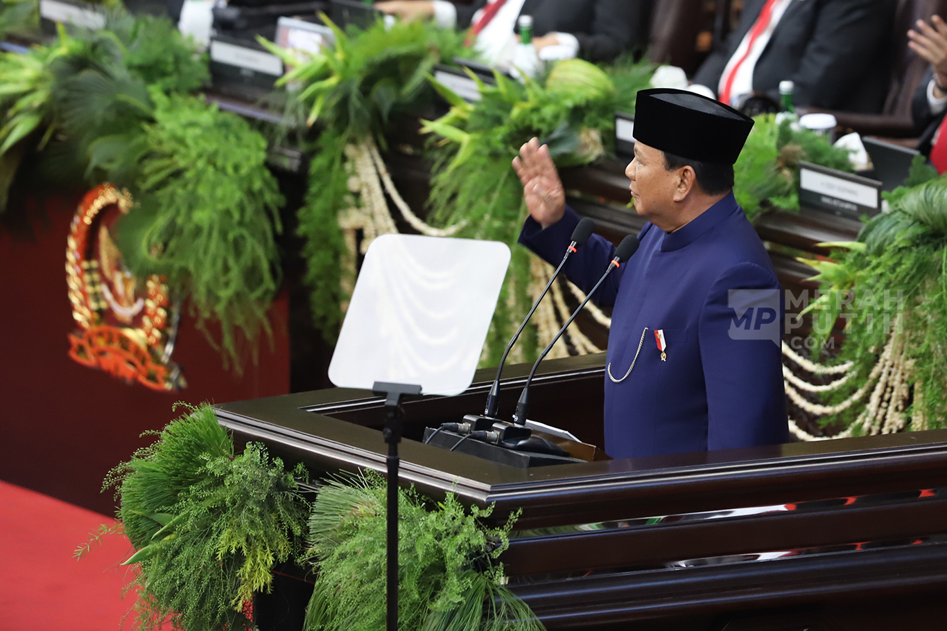 Presiden Prabowo Subianto menyampaikan pidato perdananya usai pelantikan dan sumpah jabatan sebagai Presiden RI. Dalam pidato perdananya, Prabowo memastikan untuk mengutamakan kepentingan rakyat. (MP/Didik Setiawan).