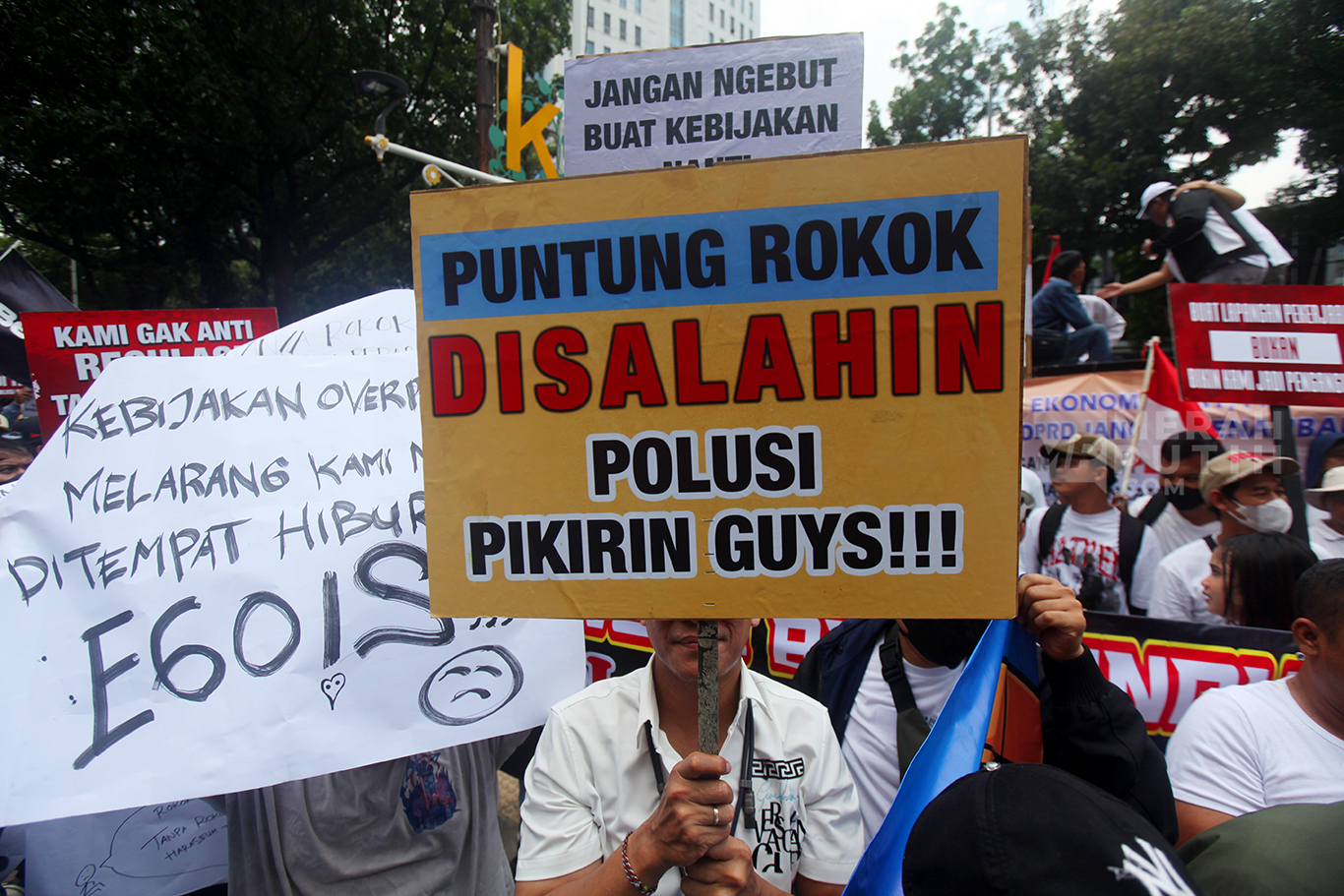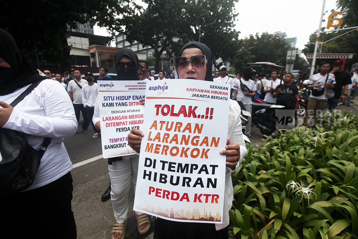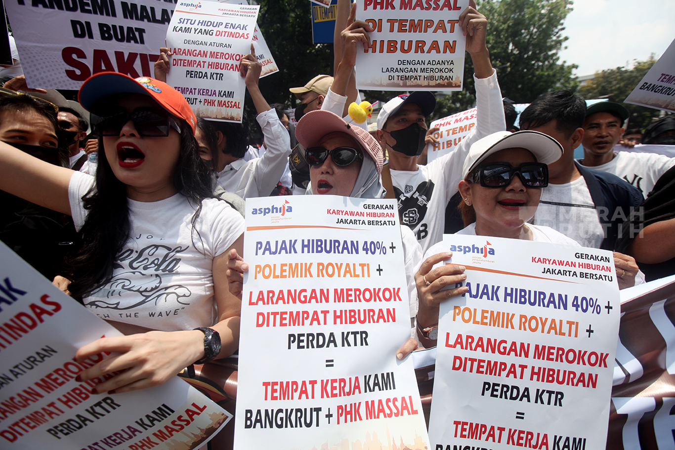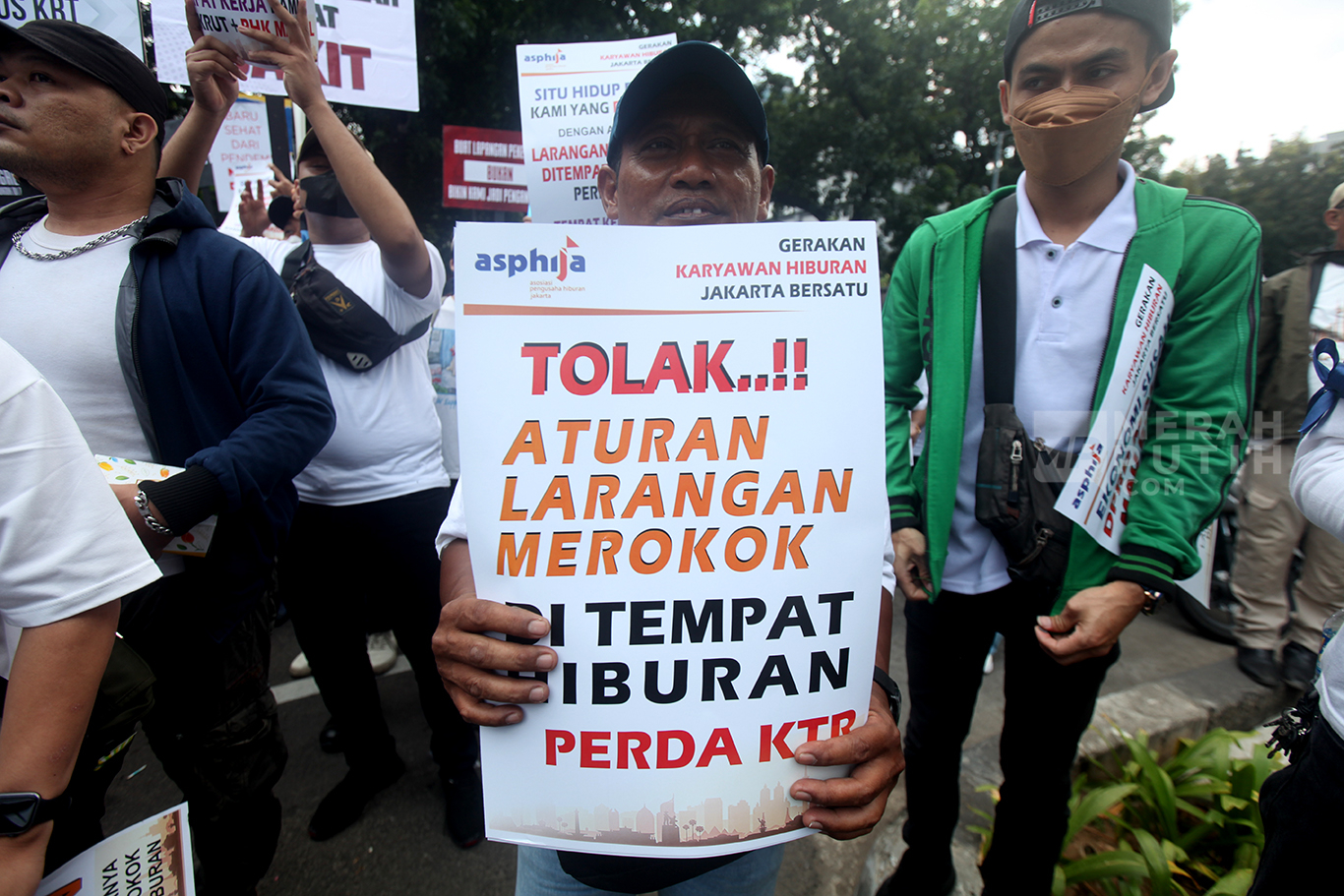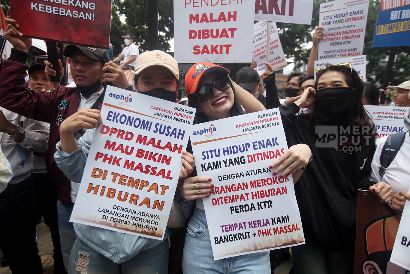 Ratusan massa dari Asosiasi Pengusaha Hiburan Jakarta (Asphija) dan Gerakan Karyawan Hiburan Jakarta Bersatu menggelar aksi unjuk rasa di depan Gedung DPRD DKI Jakarta. Aksi massa menolak Rancangan Peraturan Daerah (Ranperda) Kawasan Tanpa Rokok (KTR).