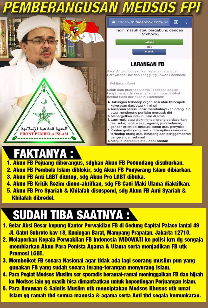 Dalam poster yang beredar, Facebook dinilai telah memberangsus akun facebook milik FPI. Selain itu, FPI juga akan melaporkan perwakilan Facebook Indonesia ke polisi karena dianggap membiarkan akun para penista agama dan ulama serta menjadikan Facebook untuk promosi kaum Lesbian, Gay, Biseksual, dan Transgender (LGBT).