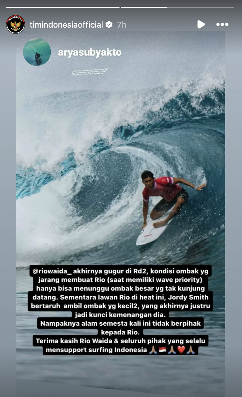 Lewat unggahan di Instagram Story, pelatih tim nasional selancar ombak Indonesia Arya Subyakto menuliskan bahwa hasil yang didapat Rio Waida tidak lepas dari kondisi ombak.