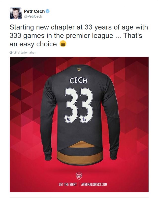"Memulai tahap baru di usia 33 tahun dengan 333 laga di Premier League. Ini (nomor 33) adalah pilihan yang mudah." tulis Cech lewat akun Twitter pribadinya.