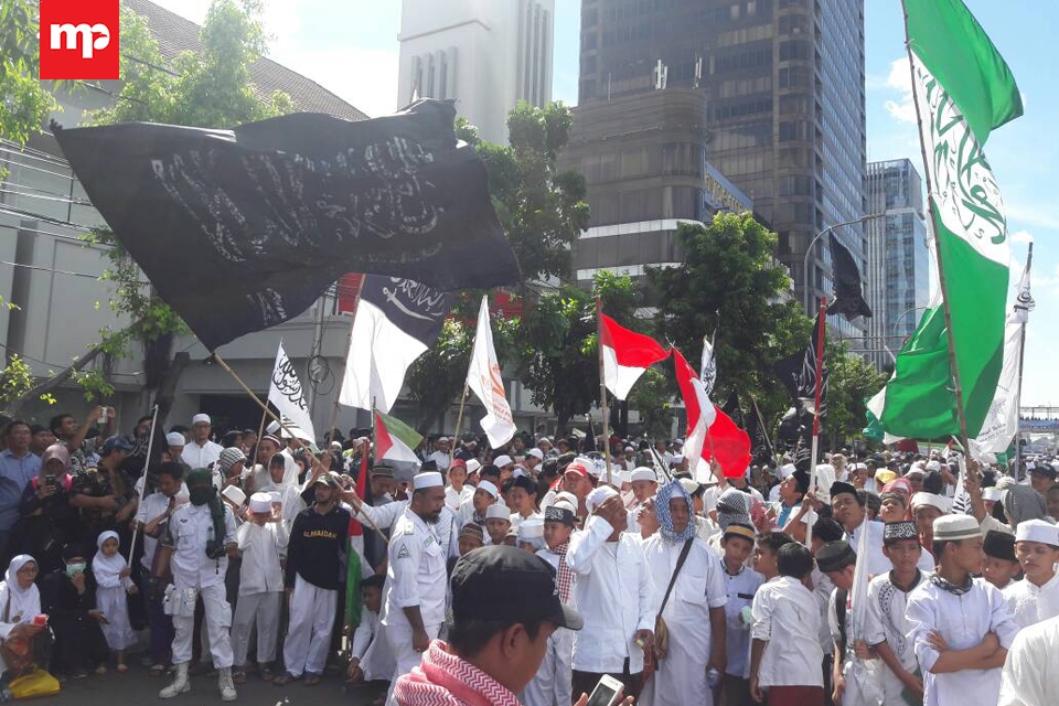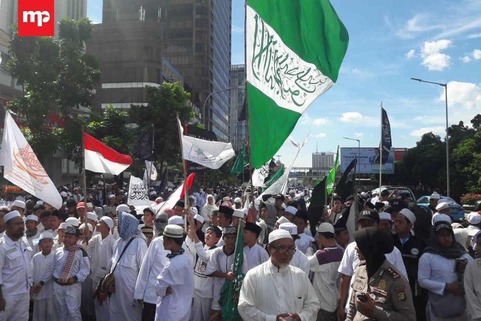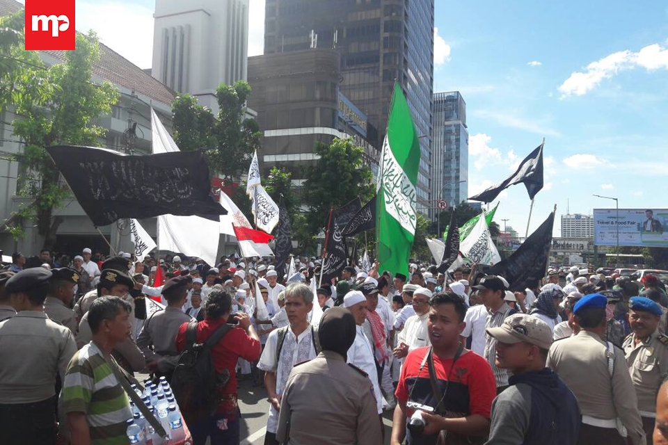 Aksi GNPF-MUI dengan menggelar longmarch dari Masjid Istiqlal ke gedung sementara PN Jakarta Utara di Jalan Gajah Mada, Jakarta Pusat, Jumat (28/4). (MP/Angga Yudha Pratama)