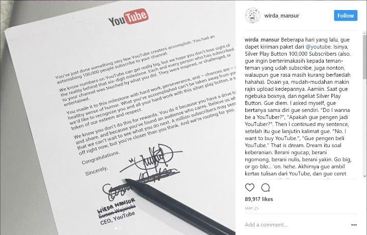 "Beberapa hari yang lalu, gue dapet kiriman paket dari @youtube. Isinya, Silver Play Button 100.000 Subscribers (also gue ingin berterimakasih kepada teman-teman yang udah subscribe, juga nonton, walaupun gue rasa masih kurang berfaedah hahaha). Doain ya, mudah-mudahan makin rajin upload kedepannya. Aamiin," tulisnya pada lampiran foto.