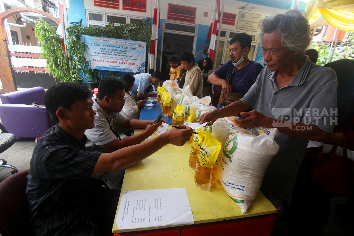 Merahputih.com - Warga melakukan verifikasi saat pengambilan bantuan pangan gratis berupa beras dan minyak goreng di Balai RW 03 Kelurahan Menteng, Jakarta Pusat, Rabu (12/11/2025).