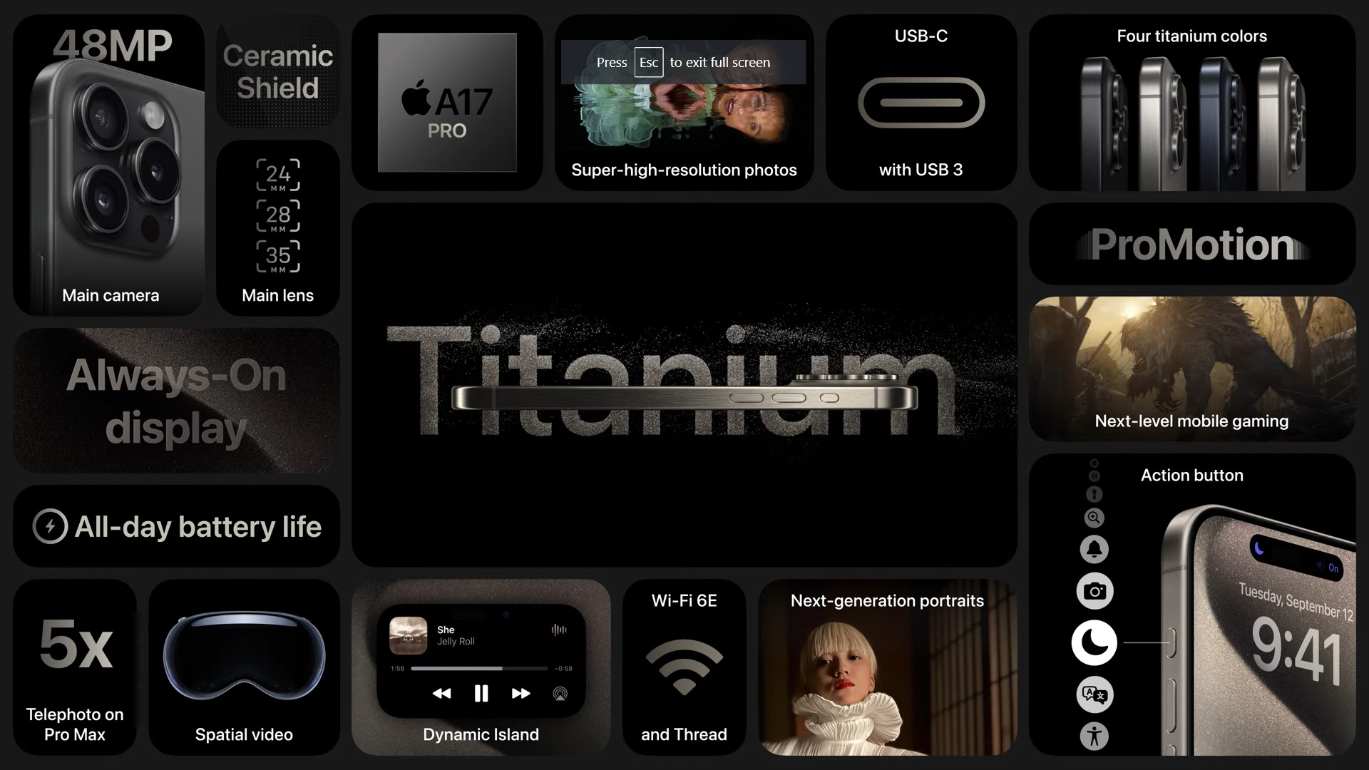 Pada sisi video, kamu bisa merekam dengan resolusi 4K60 ProRes secara langsung di perangkat atau disambungkan ke drive eksternal melalui port USB-C. 15 Pro juga dapat merekam 'video spasial' atau jenis konten 3D yang bisa kamu lihat di Vision Pro. Namun, fitur itu baru akan meluncur akhir tahun ini.