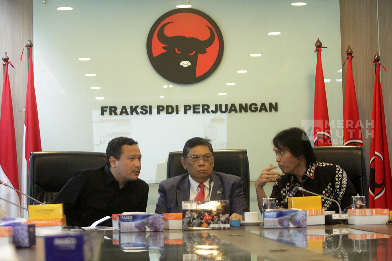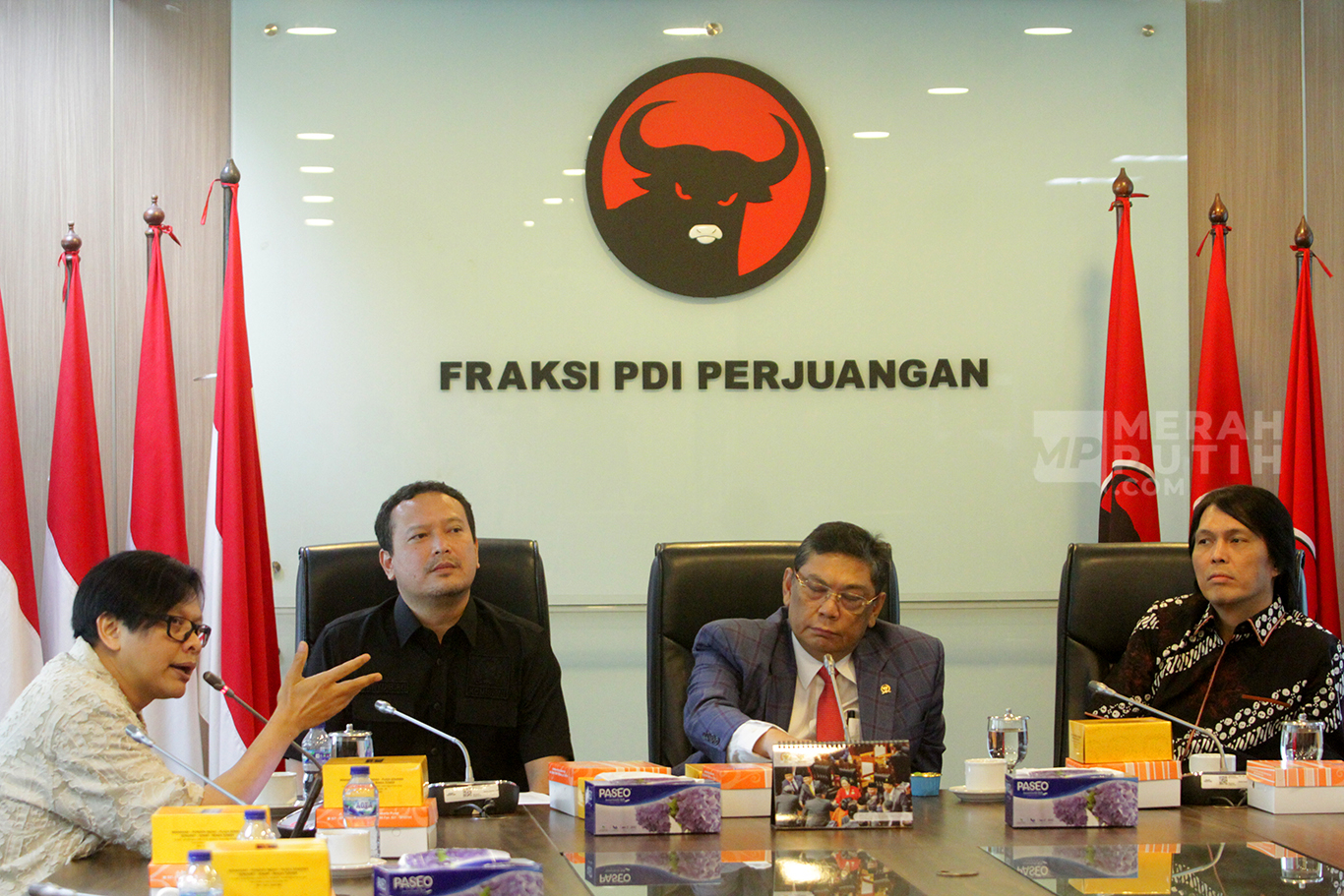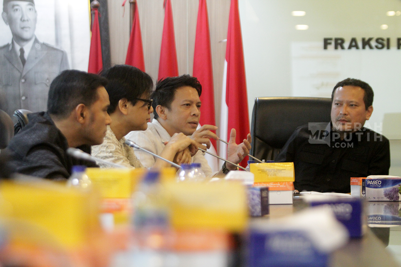 Merahputih.com - Ketua Fraksi PDIP DPR Utut Adianto (kanan), Anggota Fraksi Banyu Biru (kedua kanan), menerima audiensi pengurus asosiasi Vibrasi Suara Indonesia (VISI) di antaranya Armand Maulana (kiri) dan Ariel NOAH (tengah), di Ruang Fraksi PDIP, Gedung Nusantara I, Kompleks Parlemen, Senayan, Jakarta, Senin (10/11/2025).