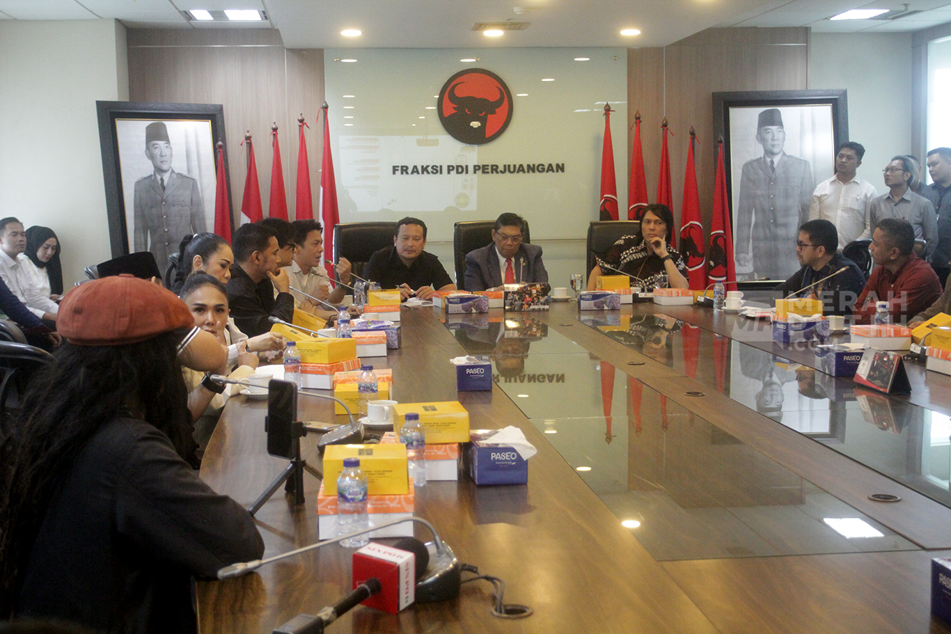 Audiensi musisi yang tergabung dalamVibrasi Suara Indonesia (VISI) melakukan audiensi dengan Fraksi PDIP. Audiensi untuk menyampaikan masukan terkait Revisi UU Hak Cipta yang dinilai tidak jelas dan multitafsir sehingga berimbas pada carut-marutnya sistem pengelolaan royalti musik di Indonesia dan menimbulkan polemik di masyarakat dan kalangan musisi. (MP/Didik Setiawan).