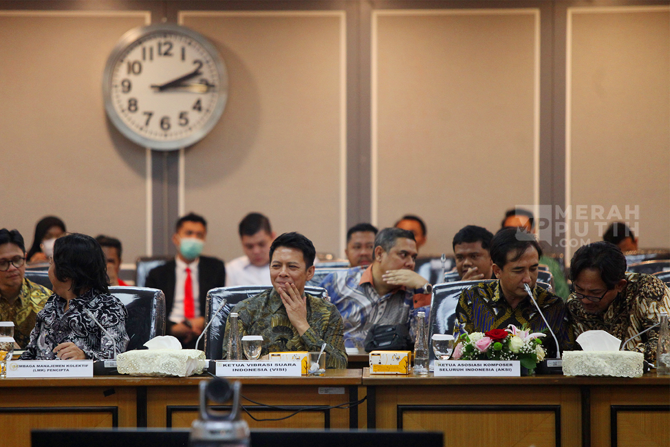 Rapat Dengar pendapat Umum (RDPU) sejumlah musisi tanah air diantaranya Vocalis noa, Ariel, Drummer PADI, Piyu dan Basiss Ungu, Makki serta Basiss Kla Project, Adi dengan Komisi XIII DPR. RDPU tersebut membahas manajemen Royalti dan permasalahan dalam perlindungan karya cipta dan hak cipta. (MP/Didik Setiawan).