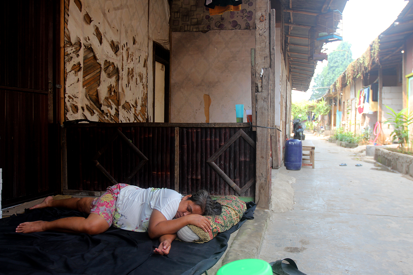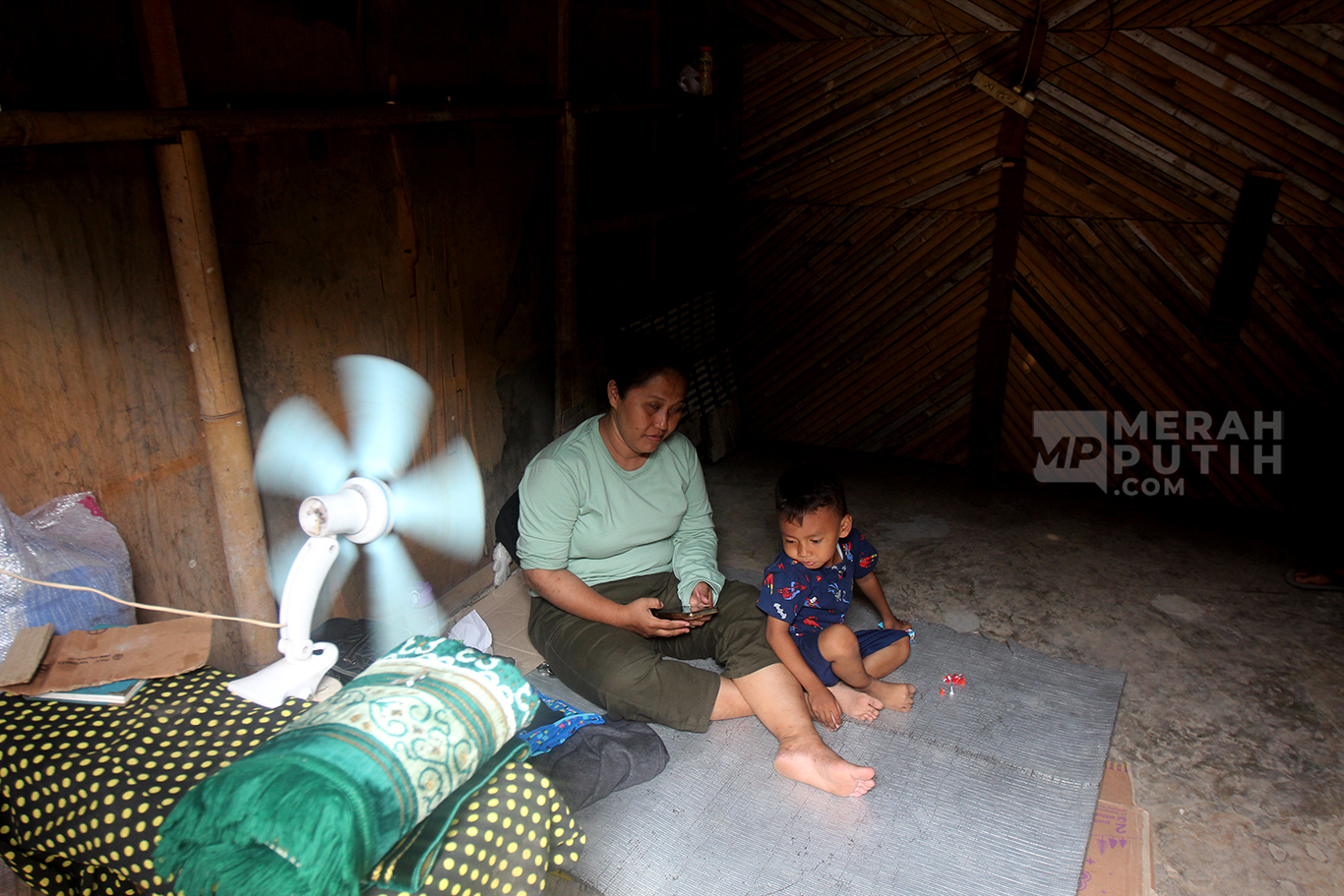 Gang sempit dengan deretan rumah berbilik bambu dan tripleks menjadi tempat tinggal sementara para pengungsi Kampung Bayam. Suasana gersang dengan atap asbes dan lantai semen ini membuat warga memakai kipas angin untuk membuat suasana adem didalam rumah.
