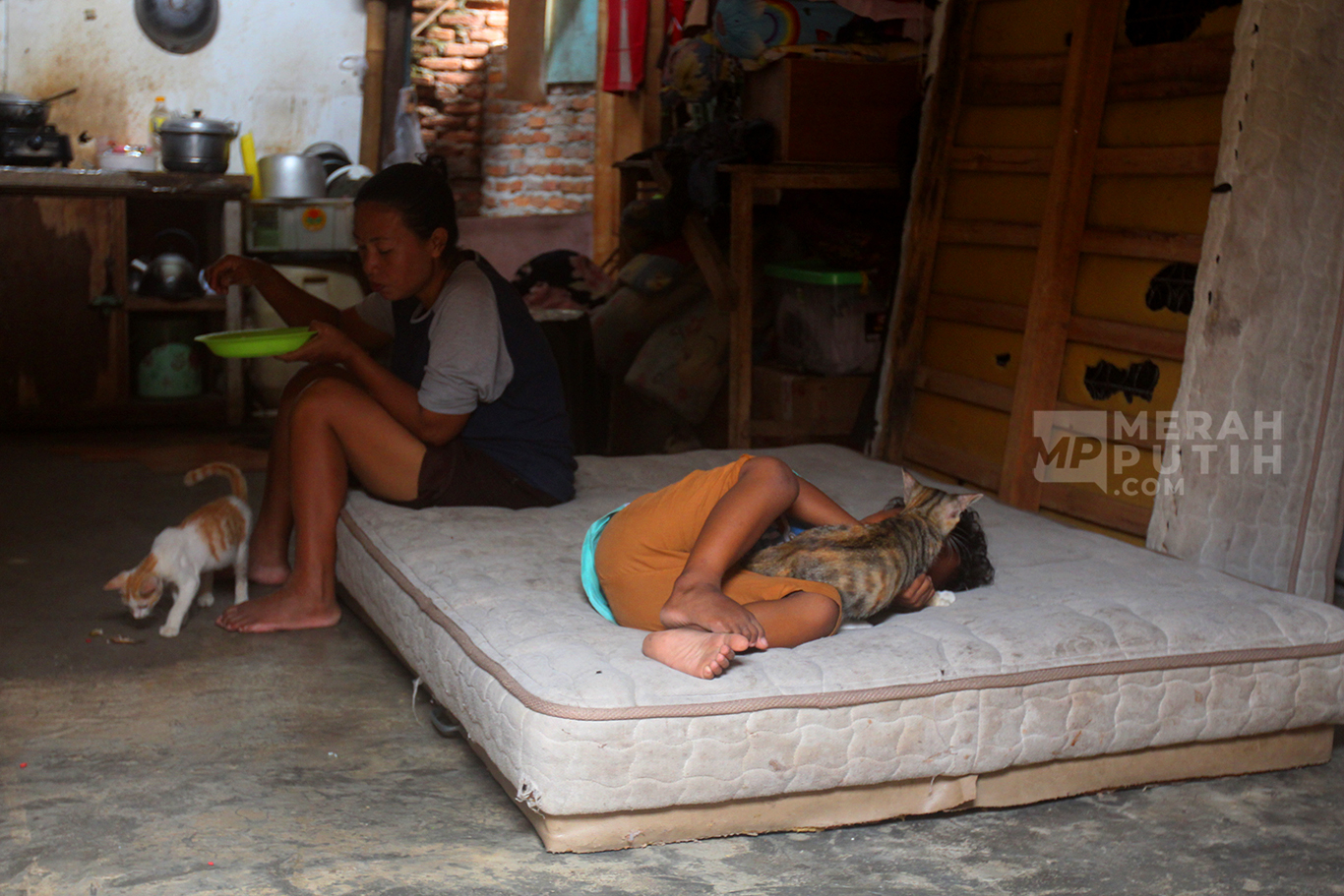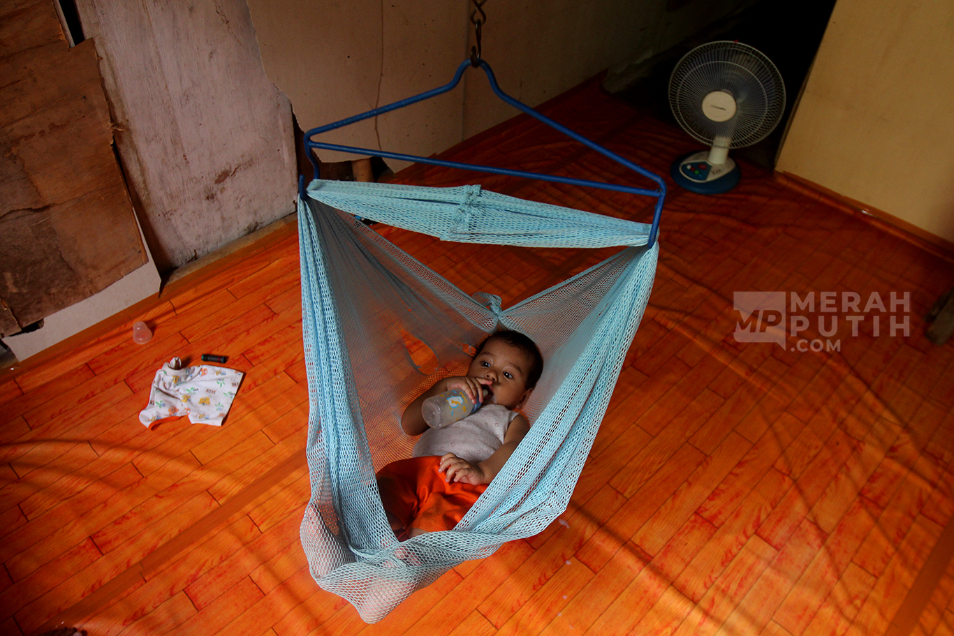 MerahPutih.com- Batita Ken (11 Bulan) seorang pengungsi Kampung Bayam saat beristirahat di hunian sementara rumah semi permanen di Jalan Tongkol, Pademangan, Jakarta Utara, Rabu (7/8/2024).
