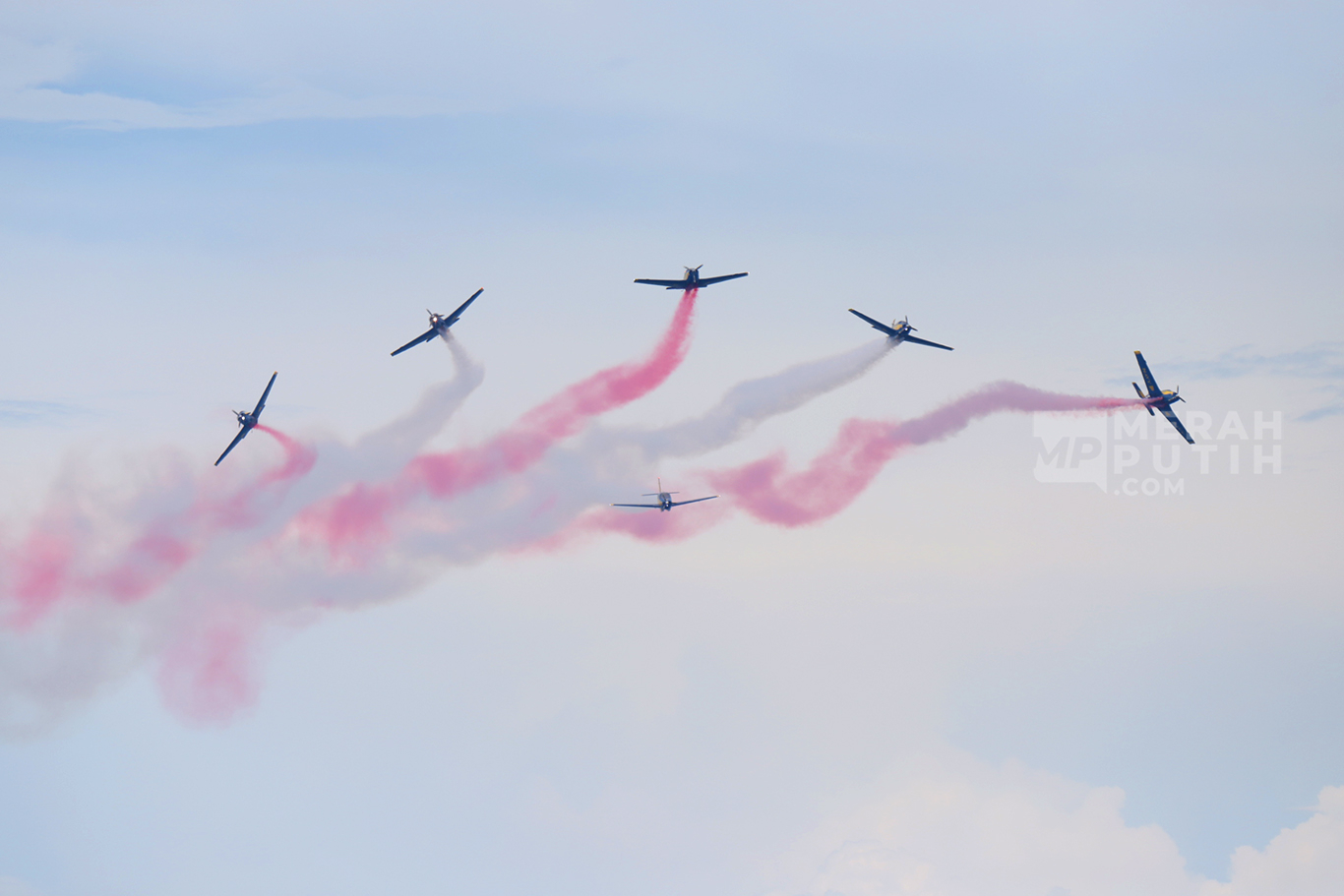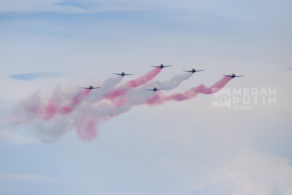 Merahputih.com - Atraksi pesawat tempur dengan asap berwarna merah putih jelang peringatan HUT ke-80 TNI di langit Jakarta, Kamis (2/10/2025).