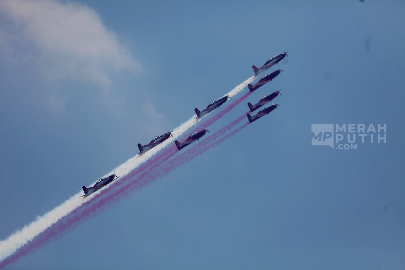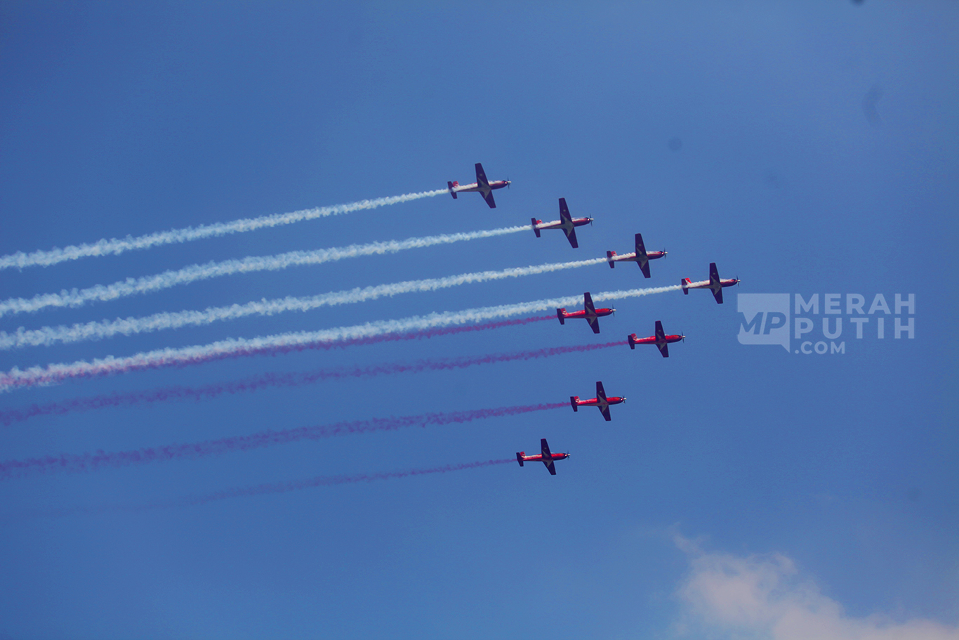 Puncak kemeriahan visual datang dari Jupiter Aerobatic Team (JAT) TNI AU. Sembilan unit pesawat KT-1B Woong Bee melakukan berbagai manuver akrobatik yang memukau. (MP/Didik Setiawan).