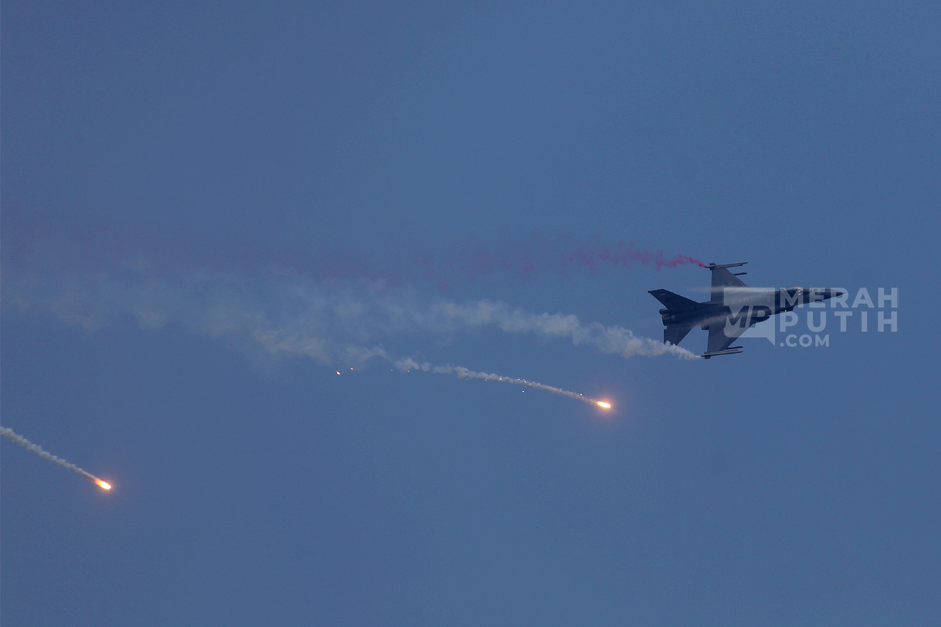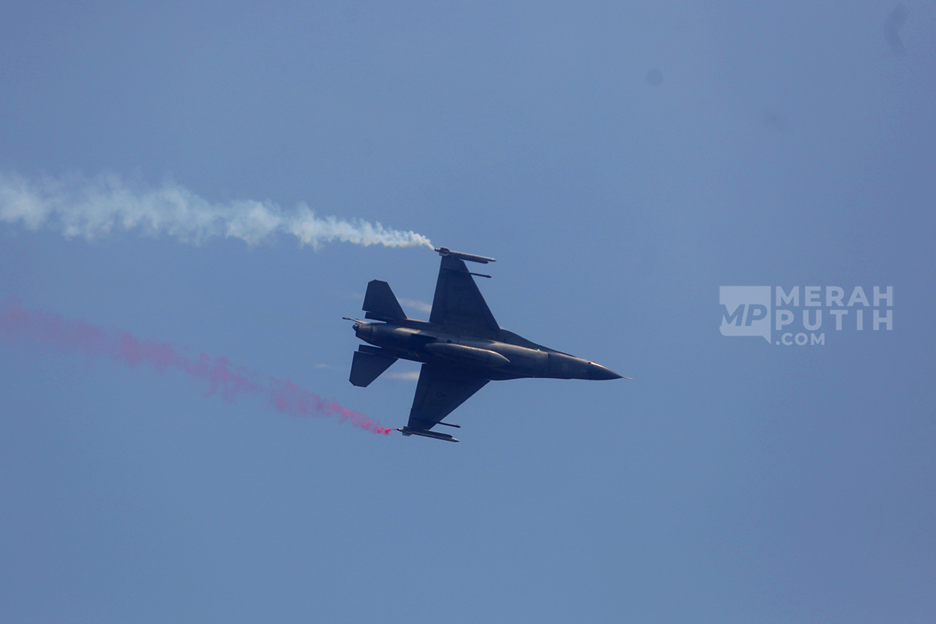Pesawat Tempur melakukan manuver terbang atau fly pass di atas Monumen Nasiona, Jakarta. Manuver tim yang juga dikenal dengan sebutan 'The Jupiters' ini pun turut disaksikan oleh Presiden Prabowo Subianto beserta seluruh jajaran tamu negara yang hadir di Istana Merdeka.