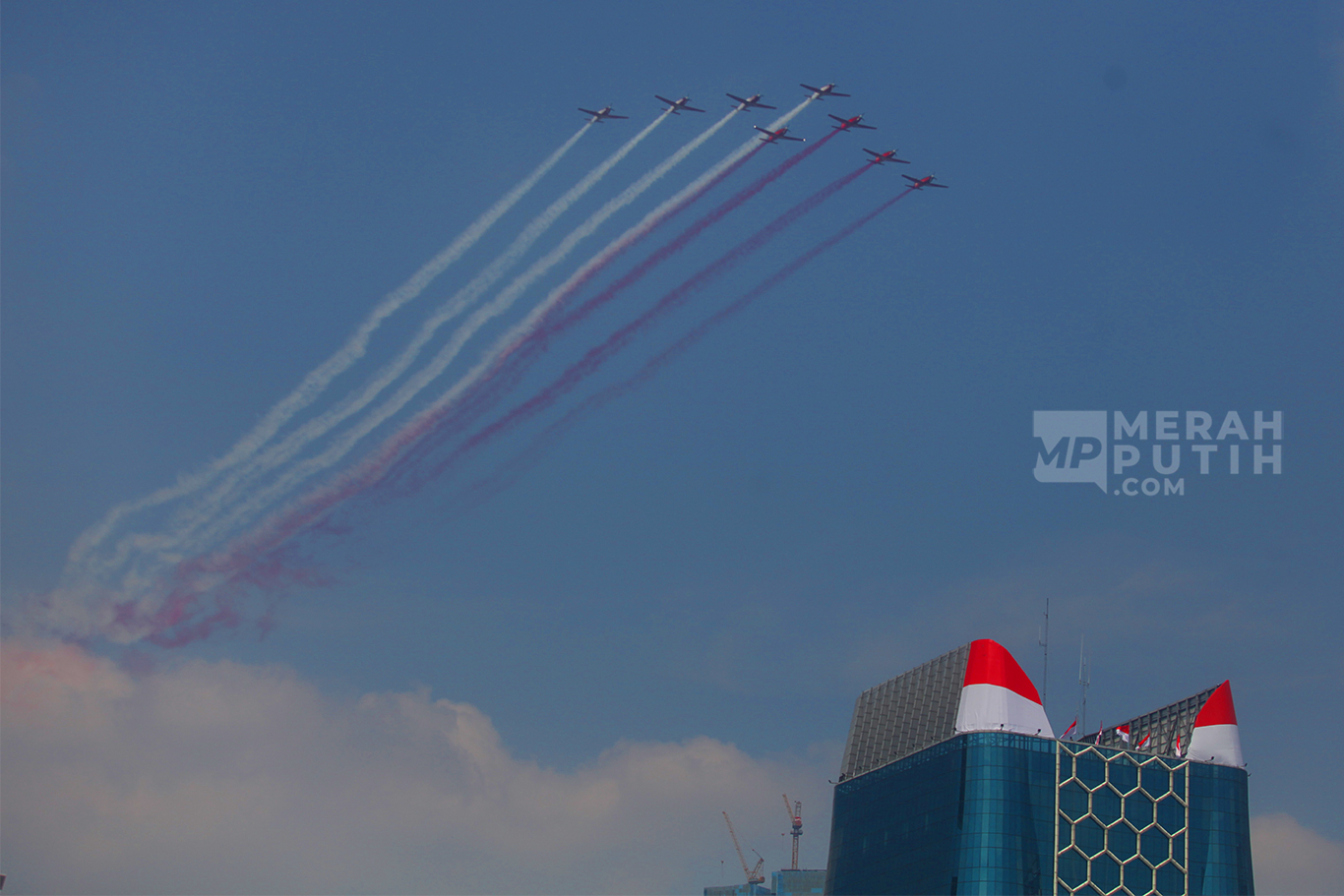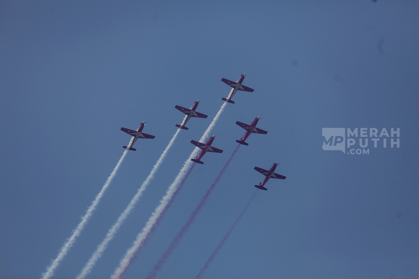 Upacara peringatan Hari Ulang Tahun (HUT) ke-80 Republik Indonesia serta peringatan Detik-detik Proklamasi dimeriahkan oleh atraksi dari Pesawat Tempur Jupiter Aerobatic Team (JAT) TNI Angkatan Udara (AU).