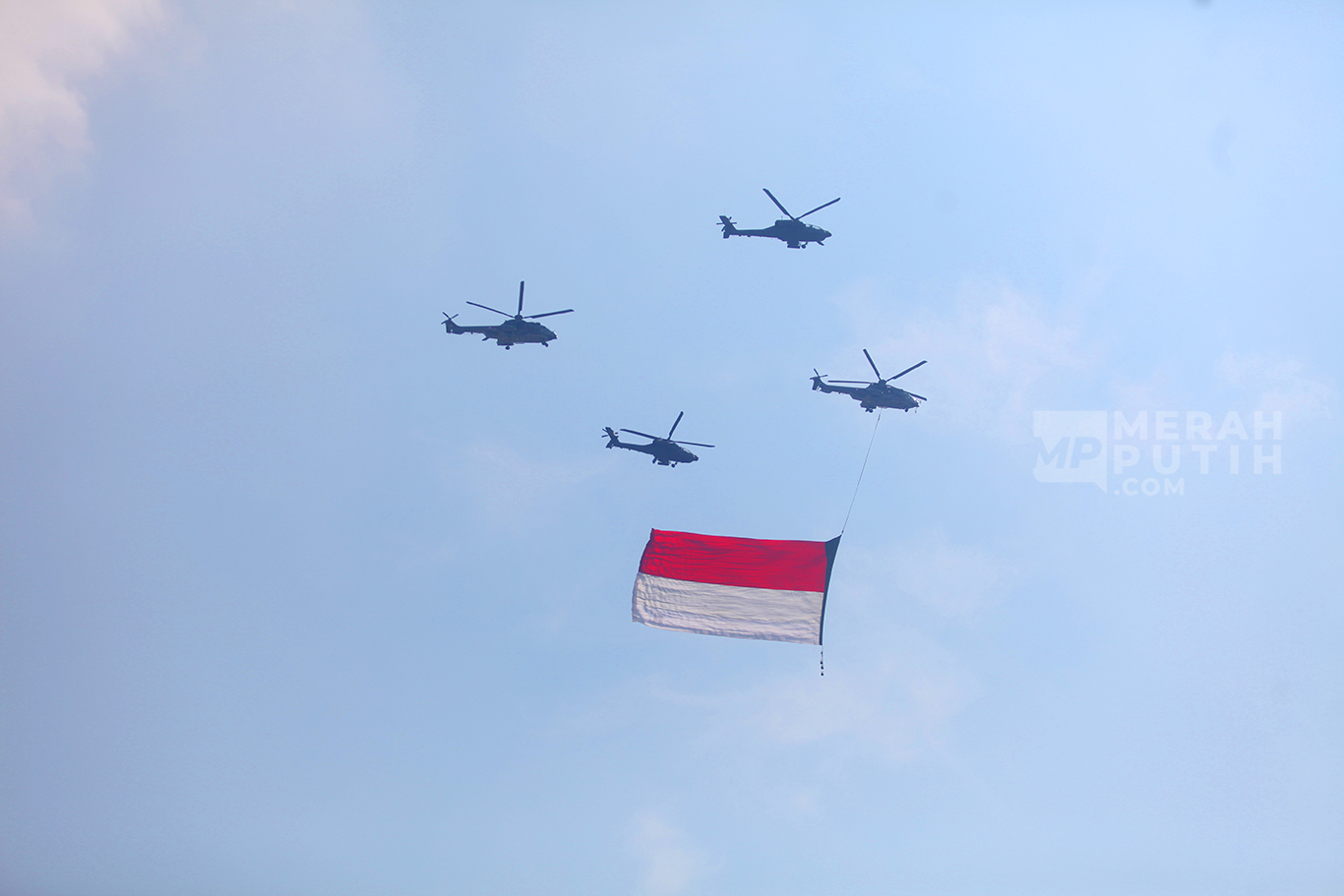 Tak hanya pesawat tempur, helikopter dari TNI AD, AL, dan Polri juga turut unjuk gigi. Empat unit Heli Caracal, dua Heli Super Puma, dan tiga Heli Apache dari TNI AD memamerkan kemampuan manuvernya. Ditambah lagi tiga Heli Phanter milik TNI AL dan tiga Heli AW-169 dari Polri, serta dua Heli Dauphin milik Basarnas.